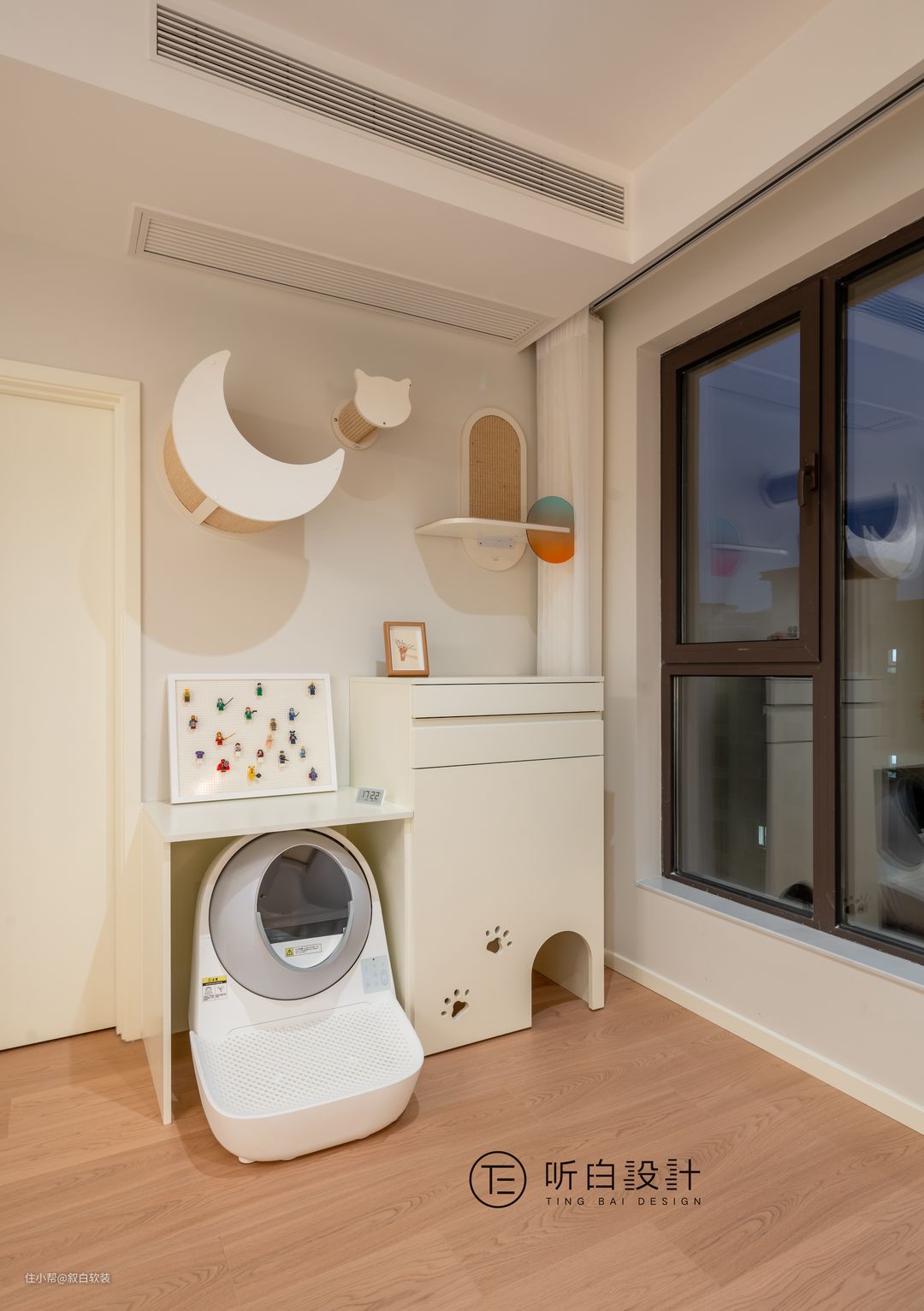 小姐姐的家里有一名重要的家庭成员——喵喵百万,为了这位可爱的小宝贝,小姐姐特别要求规划出猫咪专属的区域。 因为百万是一只长毛猫,所以夏天的制冷对它是非常重要的需求。所以我们也特别将中央空调的出风口安置在猫咪领域的上方。 全屋定制的猫窝,搭配猫爬架和电动猫砂盆,让即将入住的百万也拥有独属自己的小世界。
