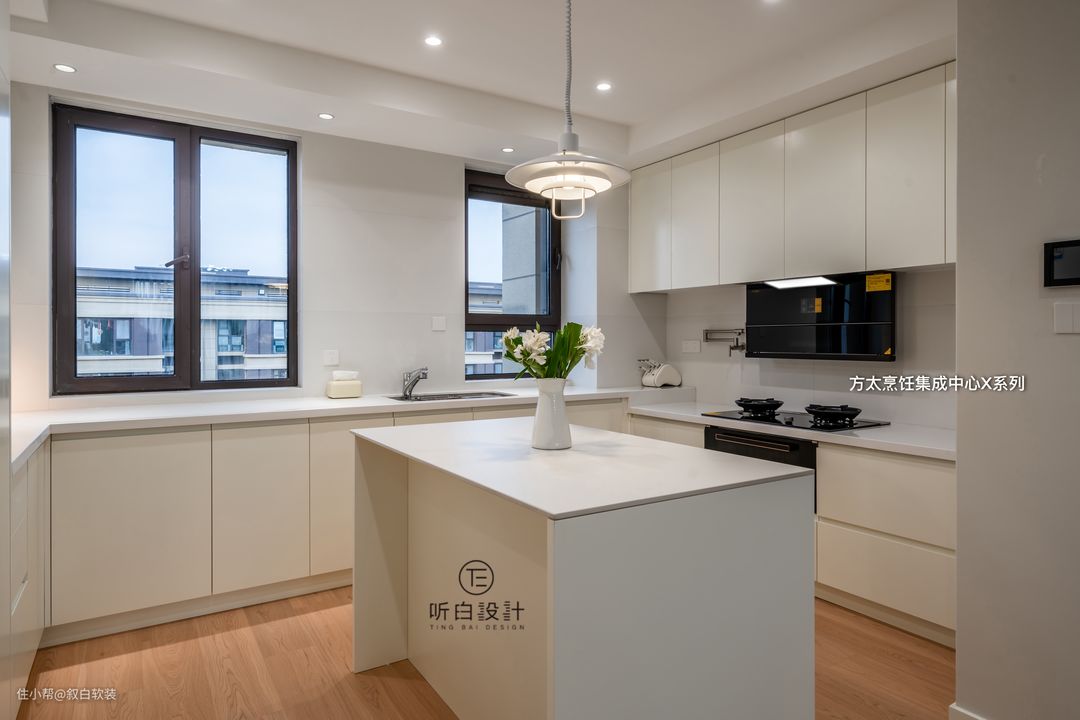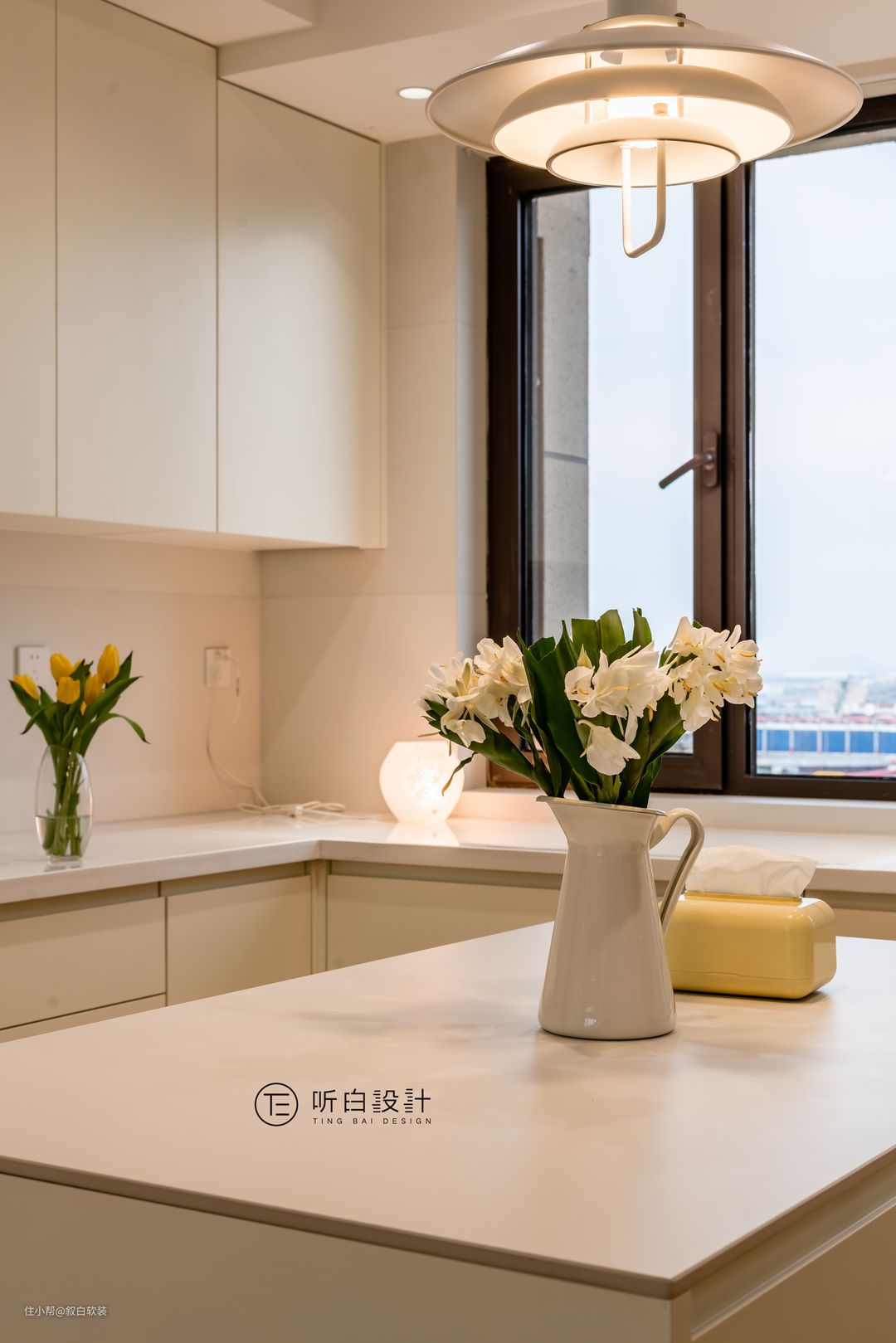 整体厨房的台面和橱柜都选择奶白色的基调,法式的优雅在鲜花与橱柜的搭配下展现出来。