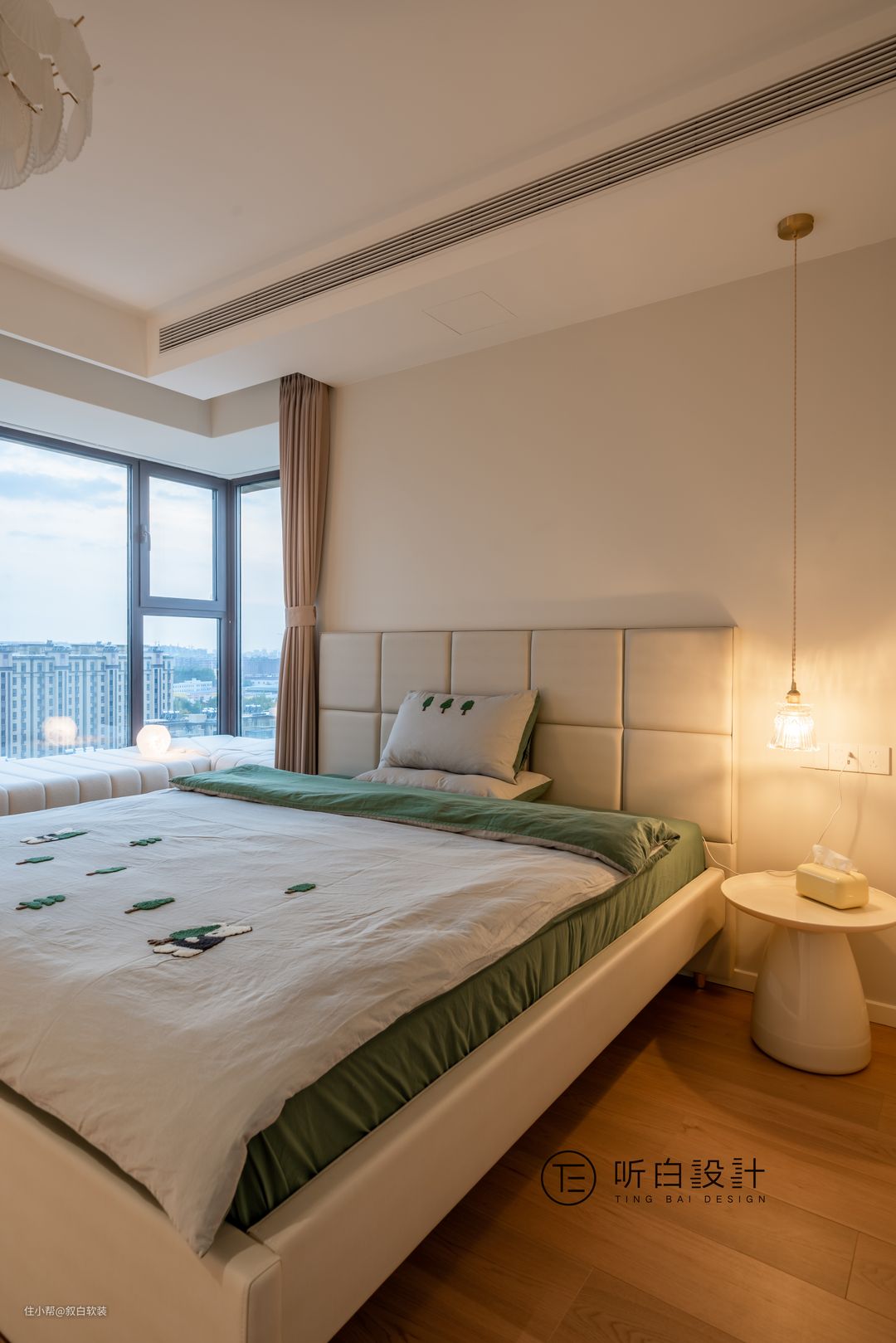 主卧规划简单,法式奶白的床铺选择非常符合全屋的风格,床头小吊灯的设置,方便又唯美。 小姐姐特别挑选玻璃小花吊灯,浪漫又精致,和客厅同款茶几作为床头柜,共同打造唯美的细节角落。