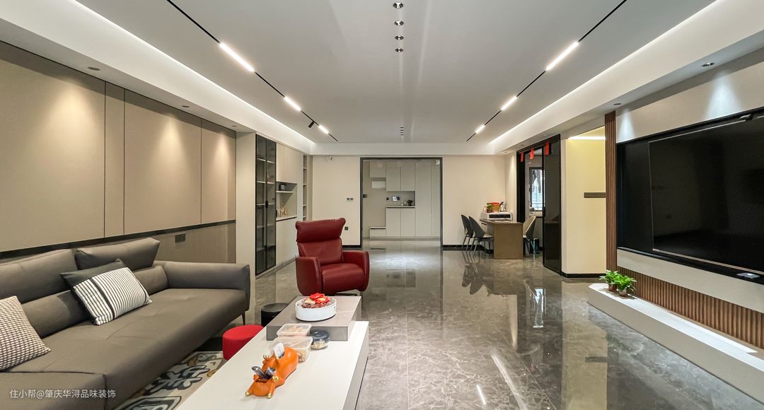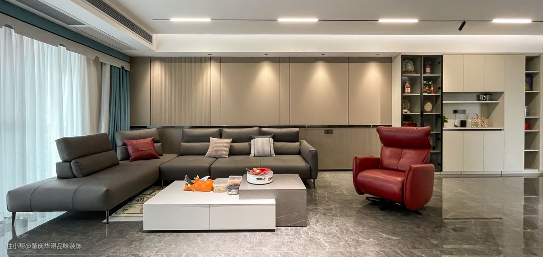 客厅摆放3.7的现代家居沙发,背景墙造型整面木饰板造型,客厅采用无主灯设计,简单吊顶搭配射灯+灯带,顶面简洁干净,视觉上显得层高更高,满足业主对空间明亮通透的要求。#沙发#客厅#茶几#护墙板