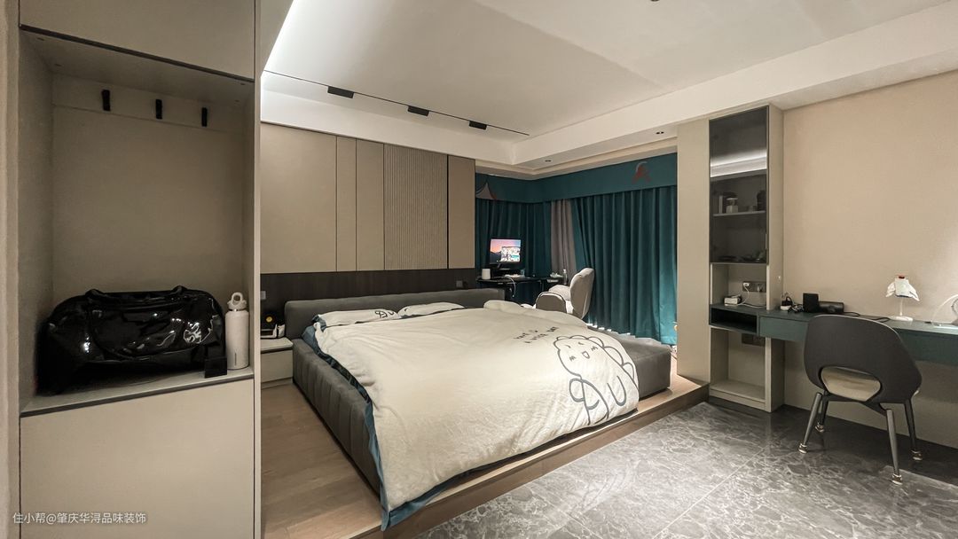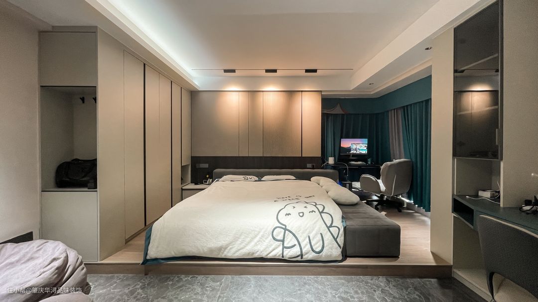 业主有打游戏的爱好,所以卧室布置了电竞区,飘窗引入自然采光,营造惬意氛围。游戏之余,日常办公也非常合适。主卧不仅是最私密的空间也彰显居住者的品味喜好。