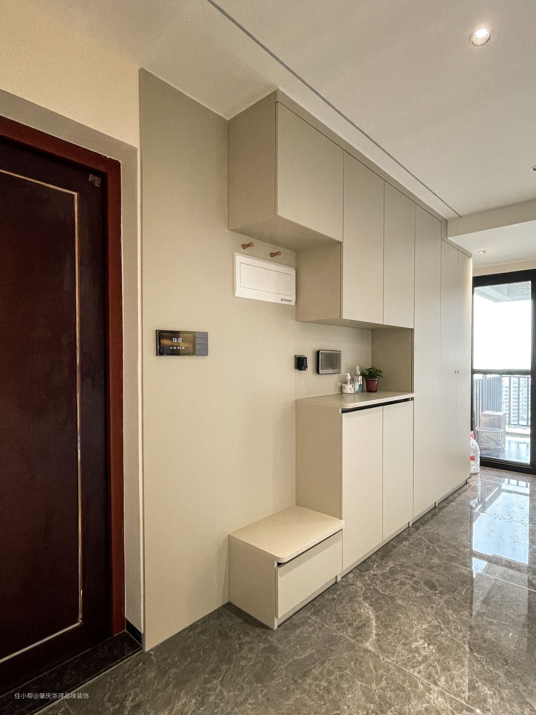 入户玄关鞋柜,实用性非常强大。 鞋柜做了换鞋凳,进出门的时候可以坐在换鞋凳上换穿鞋子,而且最下面没有做柜门,可以放室内常穿的鞋子。上面位置安装了挂钩,挂衣服或者帽子包包,都很实用,考虑真的很周到。鞋柜是做到顶面,直接到吊顶,耐脏,而且显得也比较大气,让人进来看到眼前一亮。