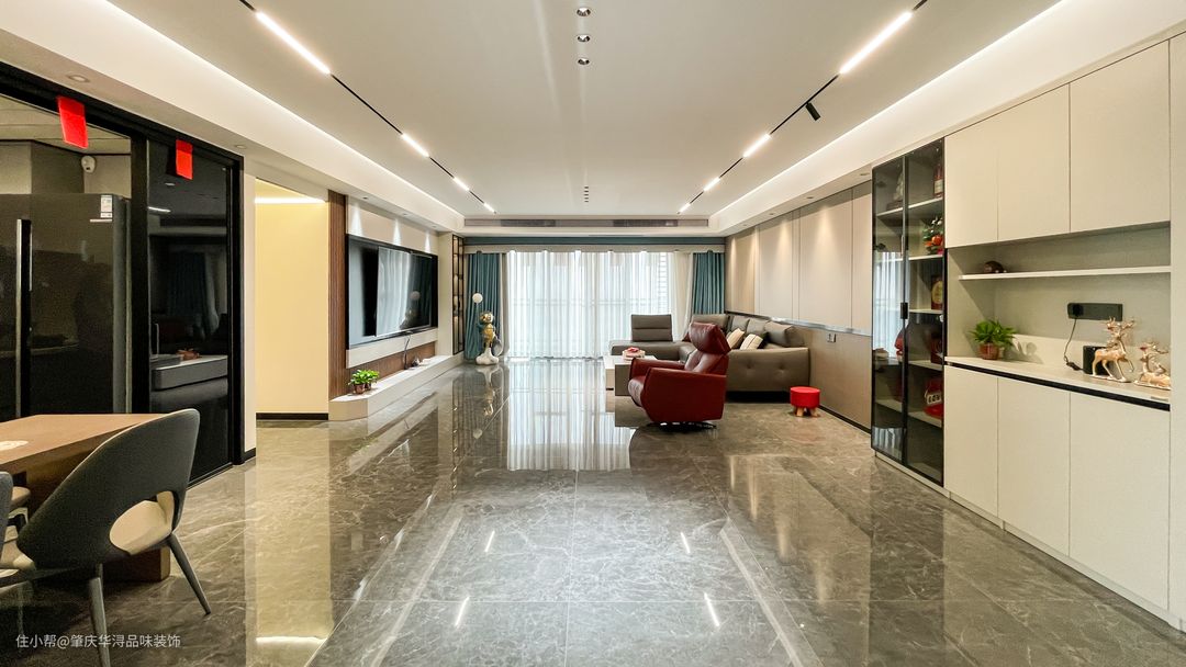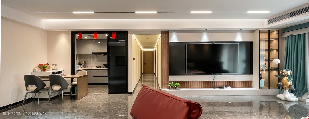 客厅电视背景墙很大气,使用木板做造型打底+中间铺的是定制大理石,电视剧内嵌黑色不锈钢电视柜,右侧打造局部装饰柜,玻璃柜门设计搭配隐形暗灯,不仅简约又大气,而且还很有档次!
