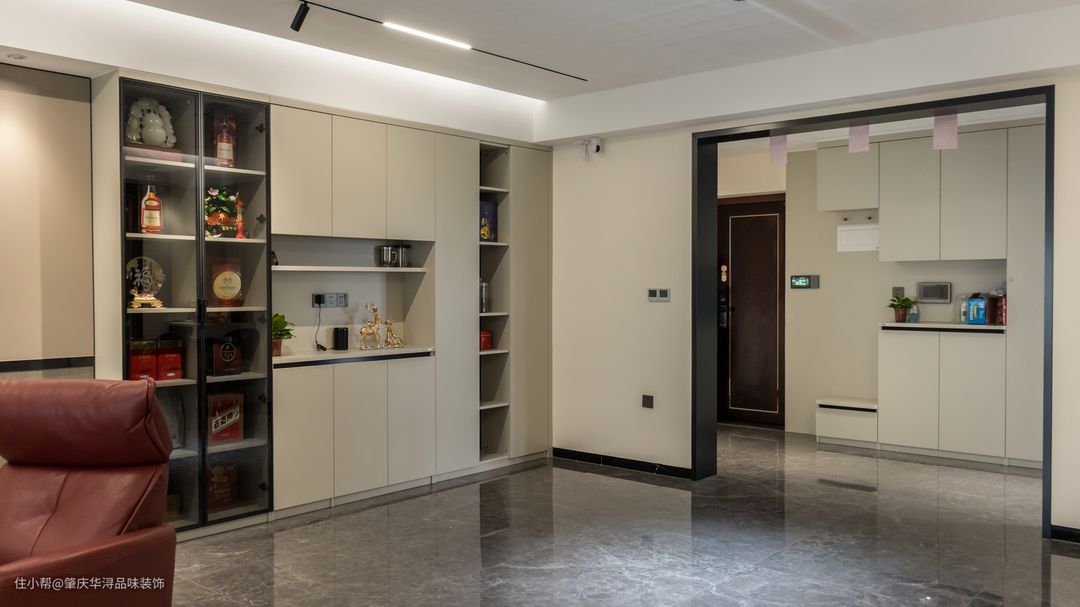餐边柜与沙发背景墙一体设计,十分显空间大气,收纳空间也到位。#客厅设计#现代轻奢