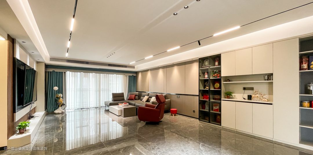 首先拥有5米大开间和4.2米落地窗,已经超越一些大平层的客厅尺寸; 休息区域抬高分层使空间布局更整齐划一; 无主灯天花暗藏所有灯光及衣柜选用一门通顶及隐藏式拉手设计