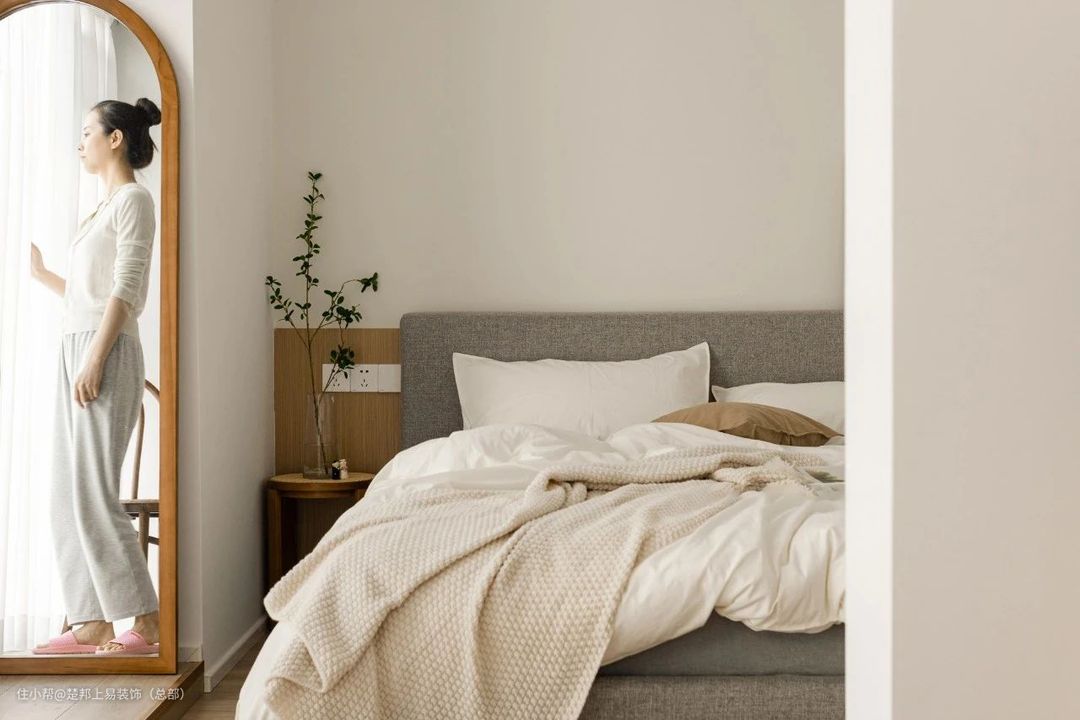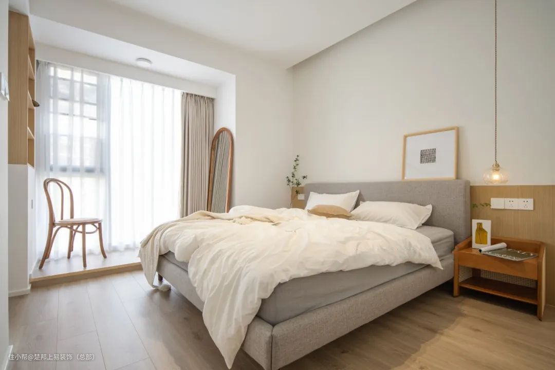 主卧南北通透采光通风极好,经过勘察打掉了主卧的飘窗台,增设地台作休闲区,满足屋主想要窝在窗边的懒人沙发里安静看书的惬意享受。