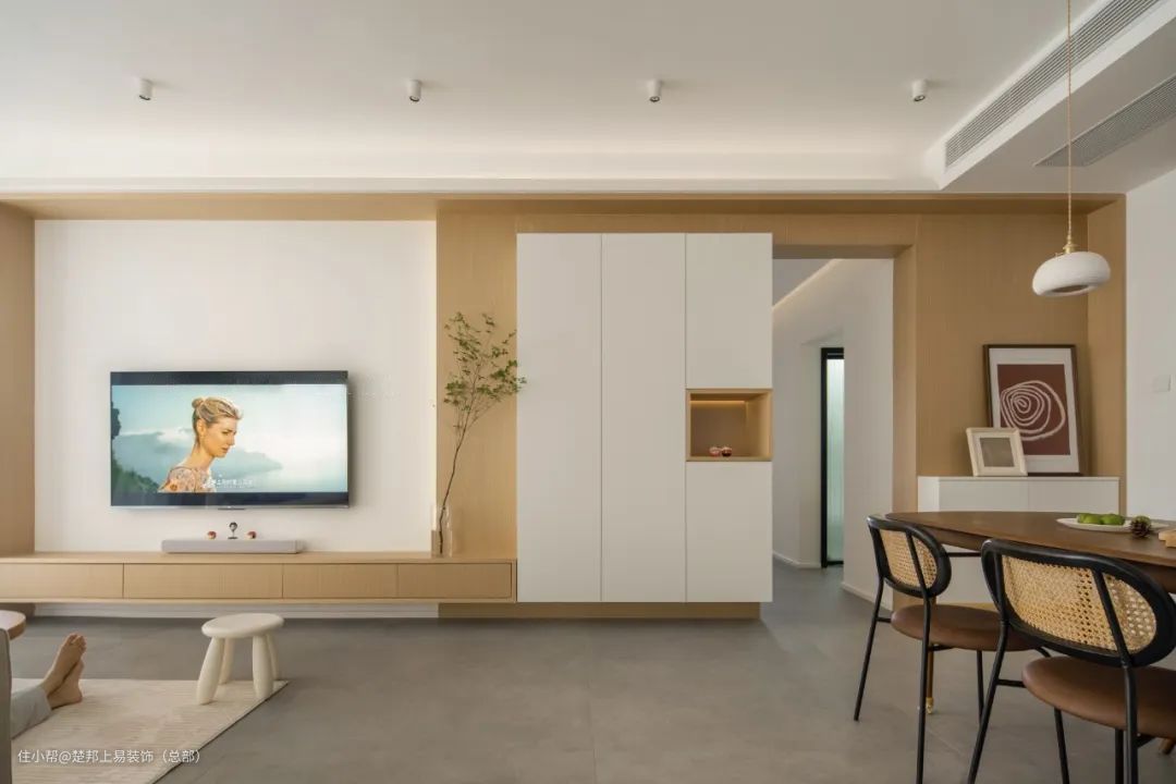 靠过道边做高柜连接矮抽增加休闲空间的储物,整体木饰面结合天花线框让电视背景和餐厅边柜融合一些,互相呼应。