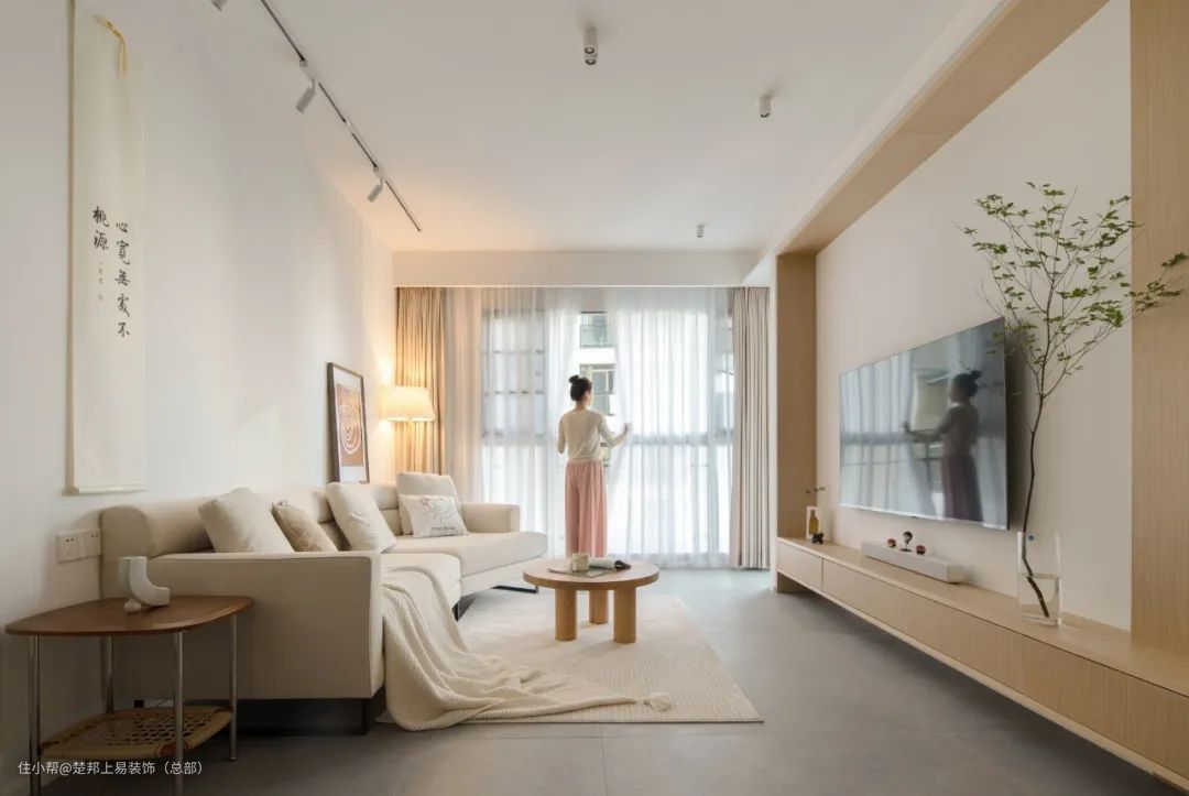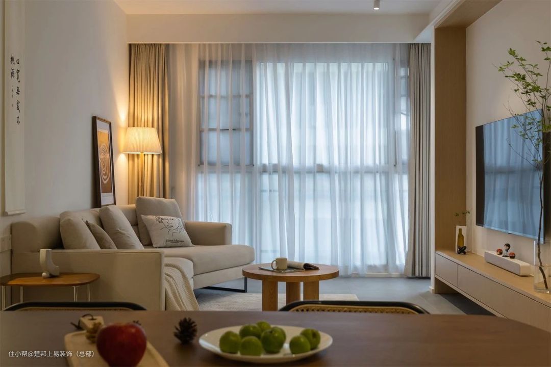 客厅朝东边可观晨曦与旭日,阳光透过窗户和纱帘洒在留白的墙面就是一副生动画像,为每个清晨伊始带来朝气与活力。