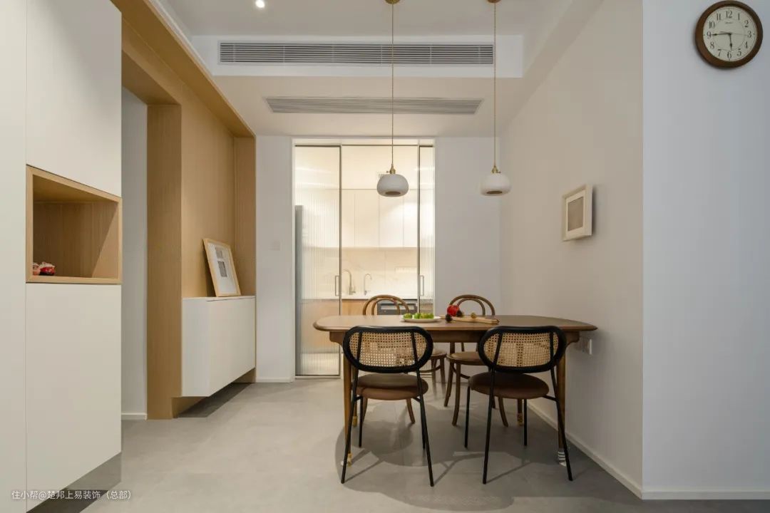 有限的餐厅开间连接公私领域,优先考虑一家人舒适的用餐空间,靠过道侧再补充收纳和展示。