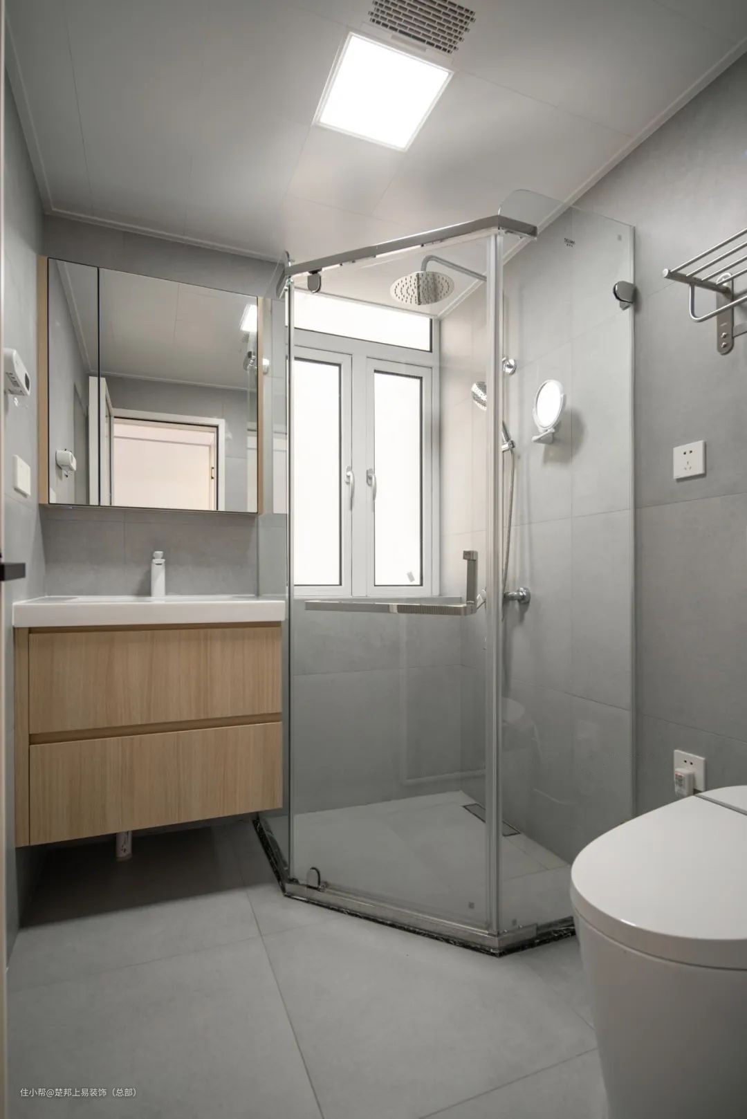 3m²正方型主卫利用墙角布置1m²钻石型淋浴间,两边设置洗漱和如厕区。
