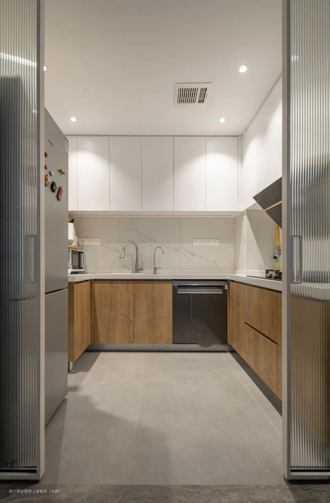 厨房合并原有的生活小阳台,做U字形布局,改善原有厨房操作台面不足收纳不够的情况,预留吊轨移门,实现可封闭可开放的烟火区。