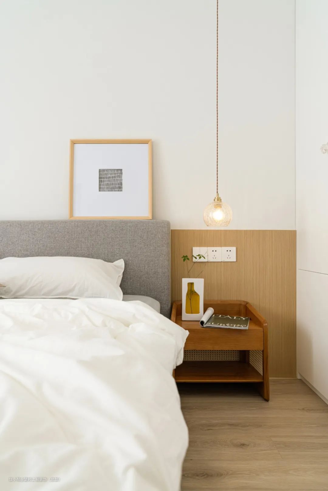 床头辅以精致玻璃吊灯和木质矮柜陪伴每一次枕边阅读。