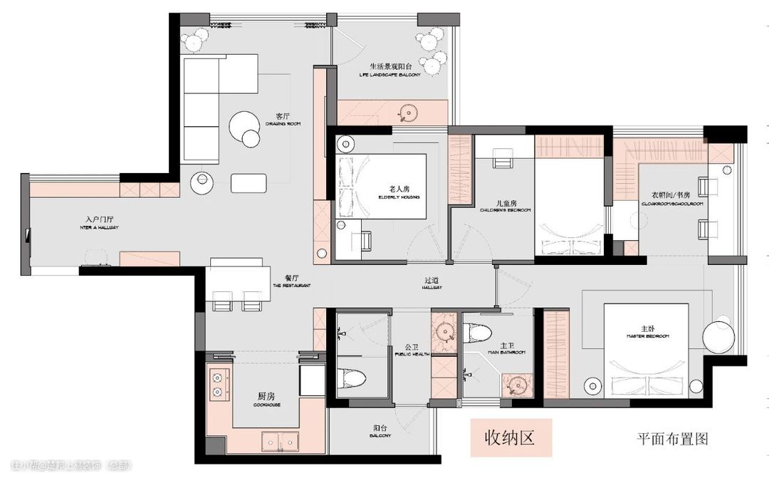 设计亮点: 1.从入户开始分别沿墙面布置收纳和使用功能,取消区域划分释放灵活的居家动线。 2.标准横厅布置适合三代同堂的强互动LDK一体化空间。 3.公卫由原本单独卫生间划分四分离形式(淋浴+如厕+洗漱+家政区),提高日常生活使用效率,同时也释放了通往生活阳台的动线,换洗晾晒收拾几步便可顺利完成。 4.老人房近公共区布置,儿童房相邻主卧,方便两代人对小朋友的照料。 5.主卧打通阳台设置步入式衣帽间兼书房空间,实现套间多功能一体化。