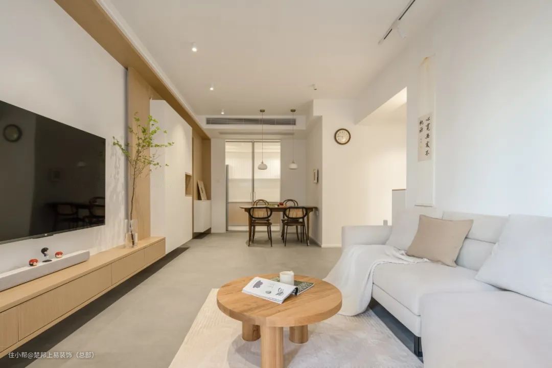 客厅开间限制,设计上做减法,没有做过多装饰背景,大三人位转角沙发靠墙摆放,电视墙保留30公分矮抽满足休闲收纳,最大化释放过道活动空间,满足家人聚会活动和去往阳台的便利动线。