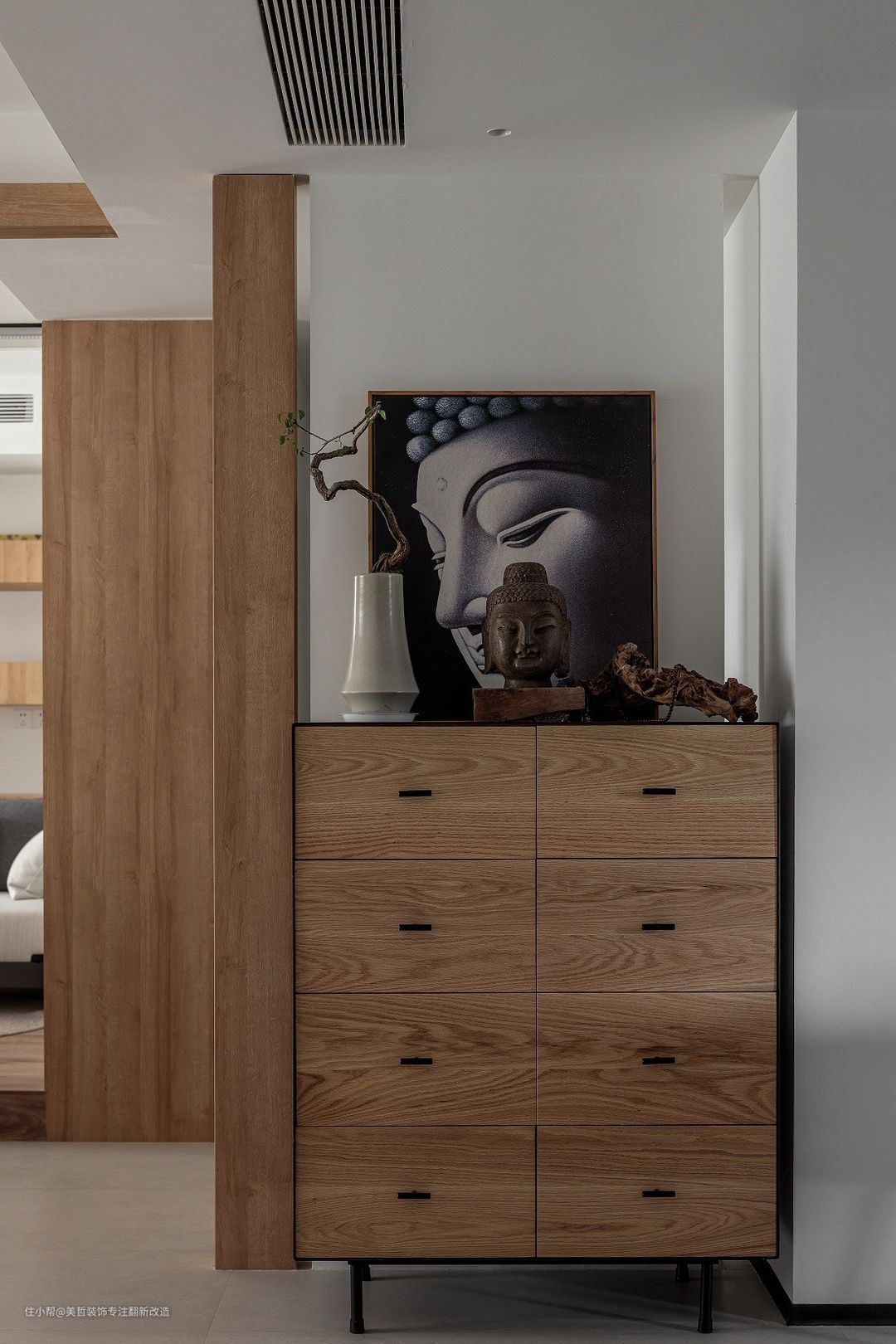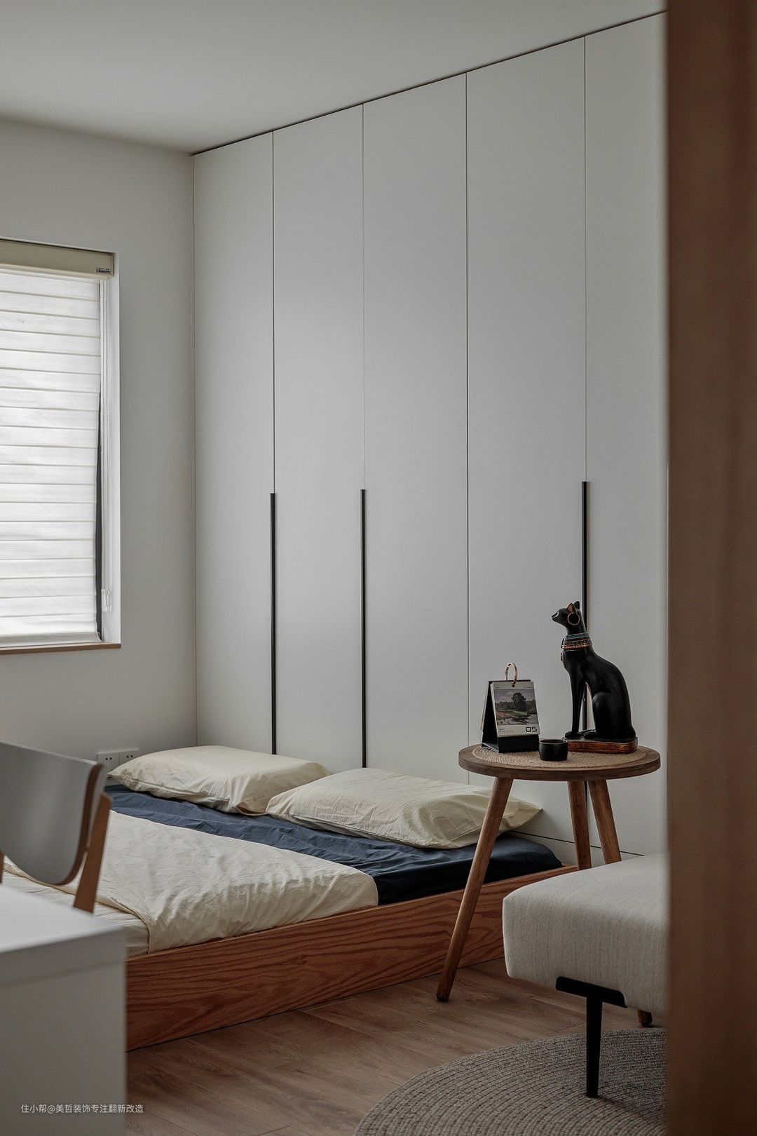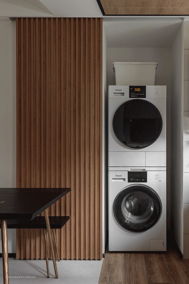回归更简单、更人性化的方式,为居住者呈现最便捷的生活动线。借由次卧空间1㎡ ,放置洗衣、烘干机,并用木格栅移动门将其阻隔,在不需要使用时,替换为墙面装饰呈现。