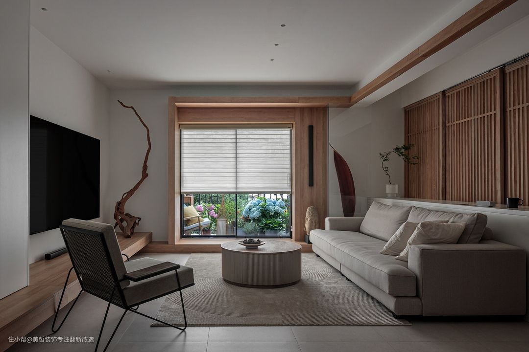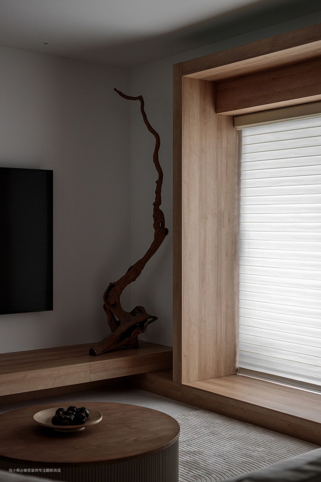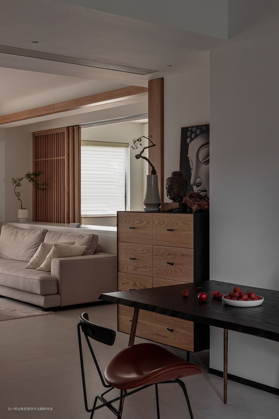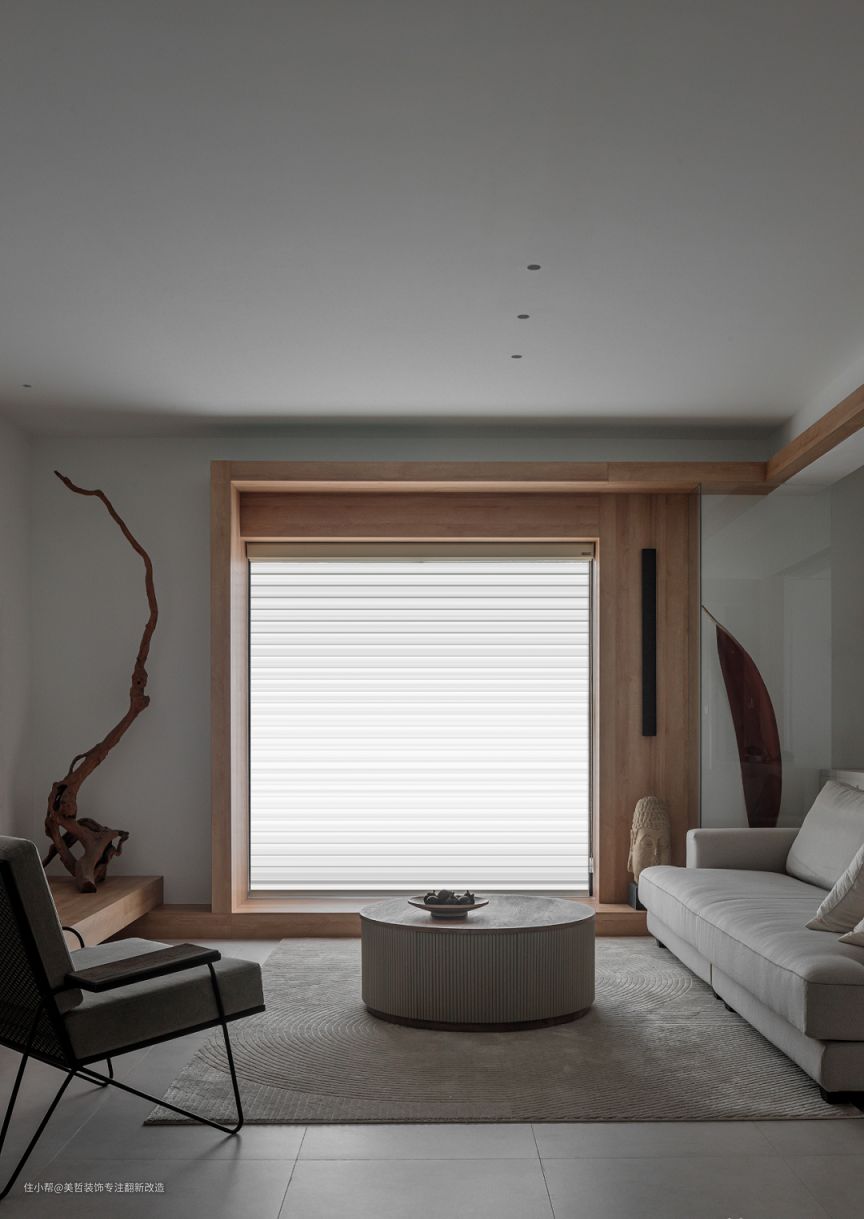 用利落简洁的木头直线为空间框景,并左右设计不对称的延伸方式。家具陈设则根据不同的动线进行灵活摆放,使得有限的空间体感再得以扩大,给人一种无边界的舒适感,形成开阔的视野布局。