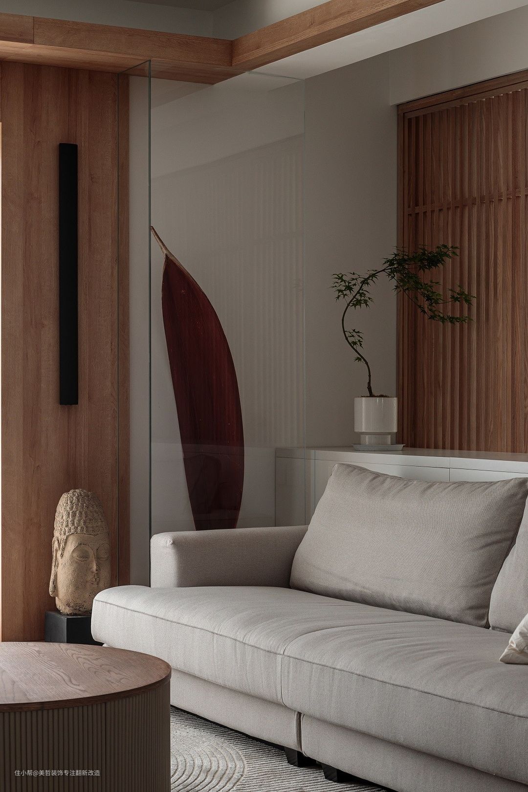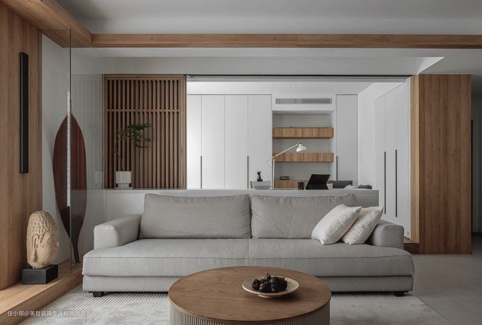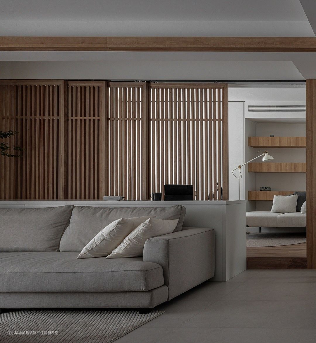四联动的实木格栅移门既是主卧门,亦是沙发背景墙,也是空间中的独立装饰。