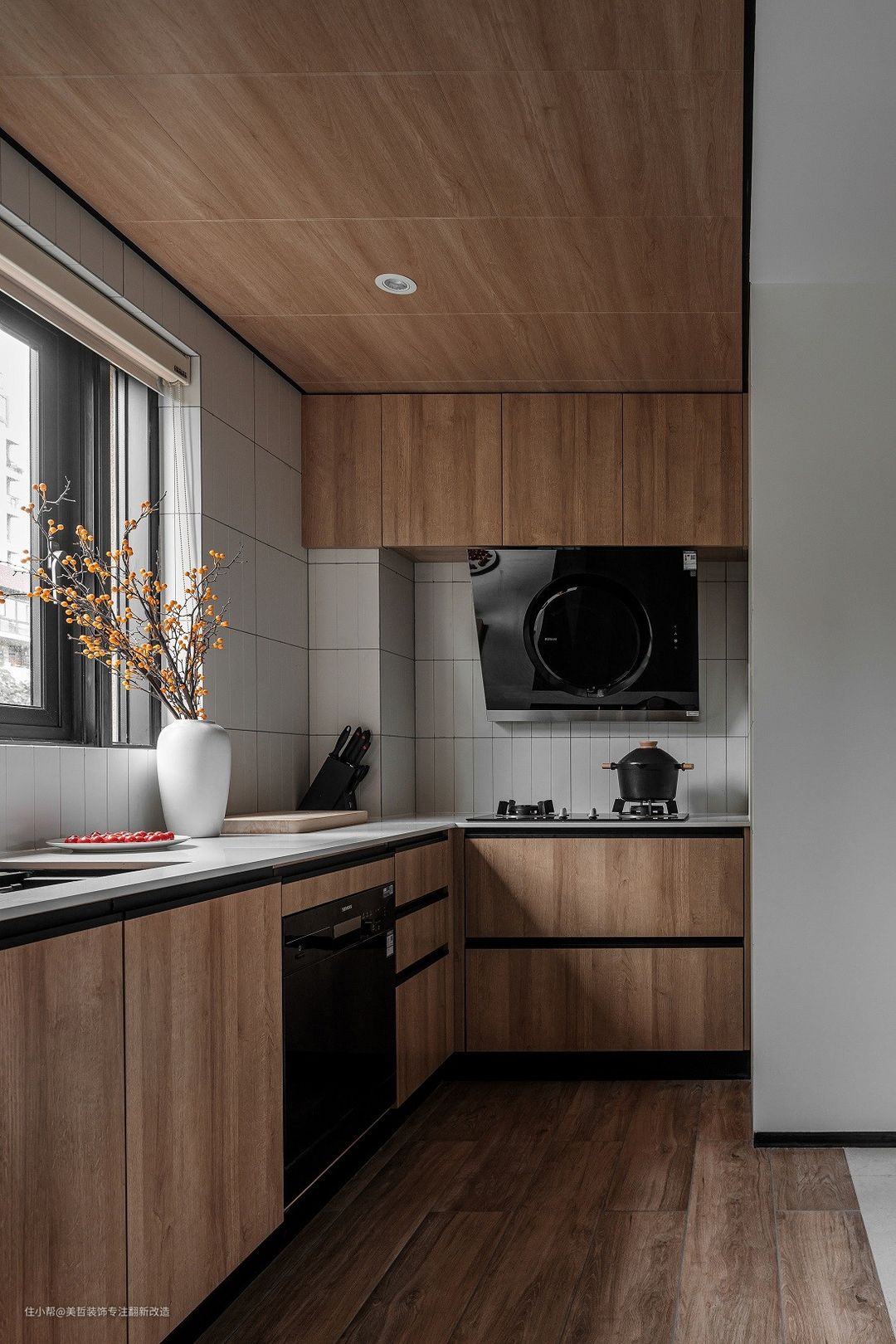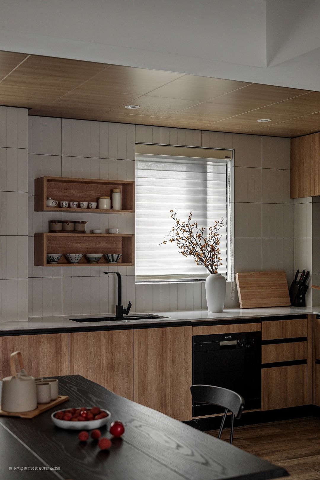 开放后的厨房通透敞亮,L型橱柜,充足的储物空间能将餐厨类的生活用品一一收纳,让空间时刻保持干净清爽。