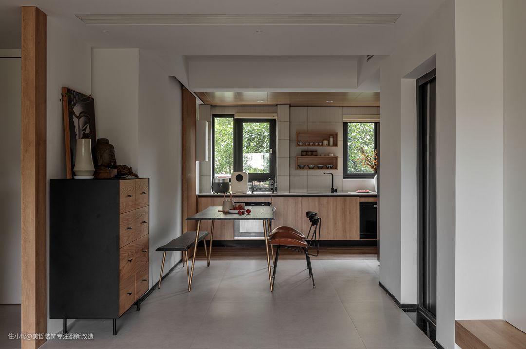 拆除厨房与生活阳台的内在墙体,合二为一,融合为全开放式空间使用。保留原始两处窗户,将景色引进室内,拓展维度让视觉变得更加宽广。在喧嚣繁忙的城市中创造一个诗情画意的世界,让故事发生,趣味生长。