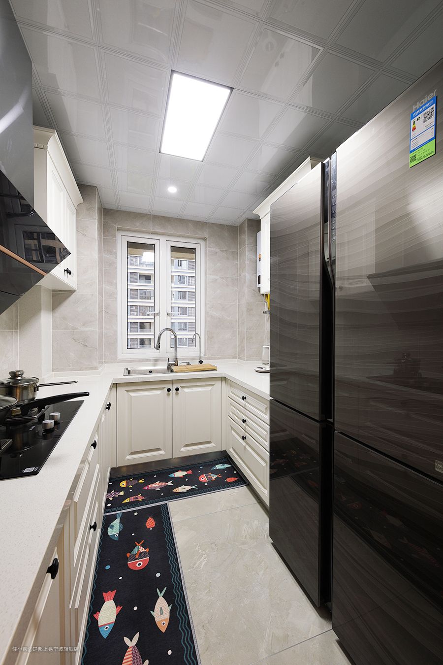 厨房整体比较明亮,清洗后窗户可以通风。侧吸的油烟机不担心碰头,大量的厨柜也不缺乏收纳空间。