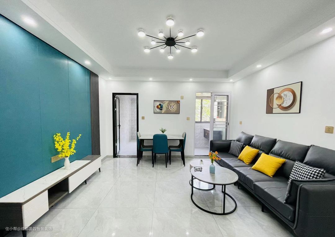 客厅的空间中,蓝色调的饰面板做的电视背景墙搭配着顶部的筒灯设计,营造出一个质感满满的空间。沙发选择了黑色的皮质设计搭配着亮色调的抱枕,避免空间的单调性。