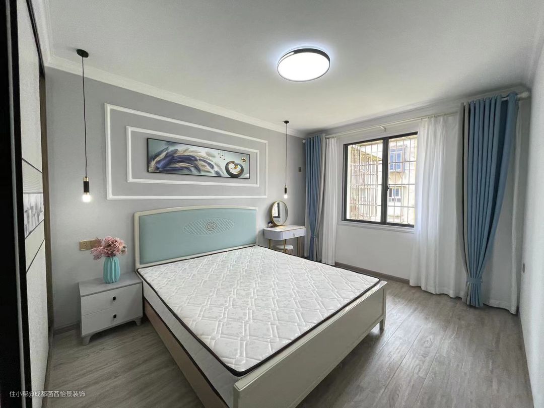 次卧的空间中,一张简单的双人床搭配着顶部的灯光与窗户外的阳光,营造出一个轻松舒适的休息空间。