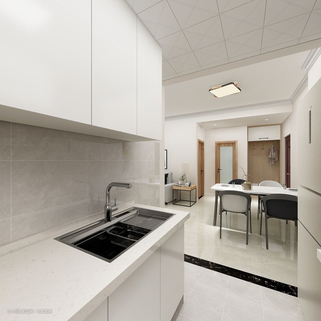 两米长的双排橱柜,并排而立,把柜内收纳做到整整齐齐,宽敞入口摆放一个三层冰箱,冷藏冰鲜冷冻清清楚楚。