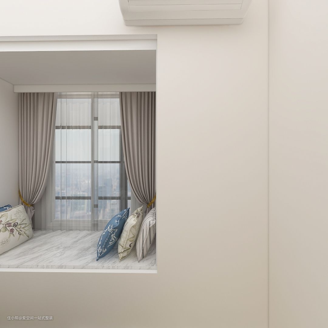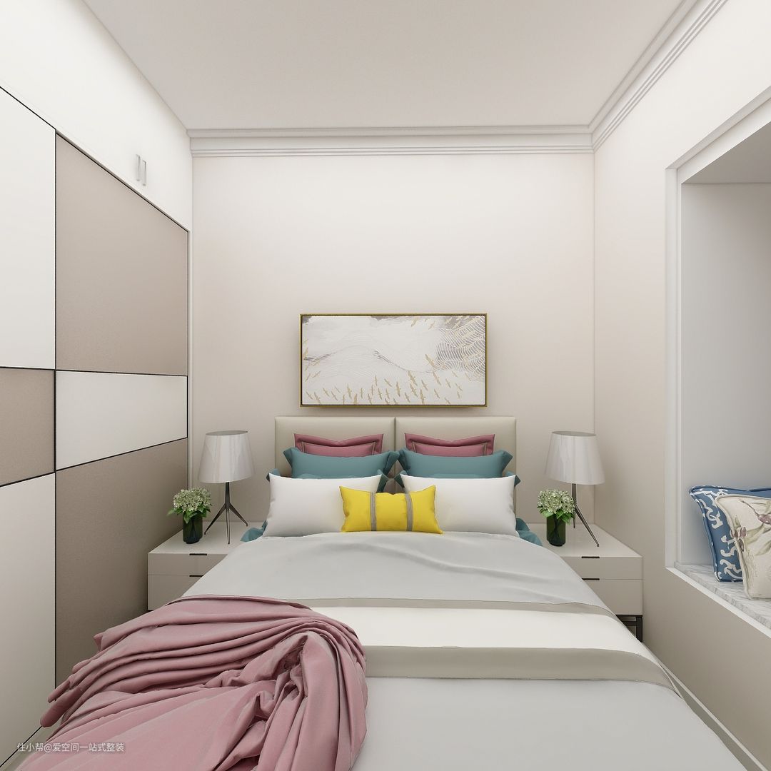 次卧呈矩型,推拉门更加节省空间的同时,飘窗铺设软垫,增加靠枕,让飘窗也变得更加休闲随性实用起来。