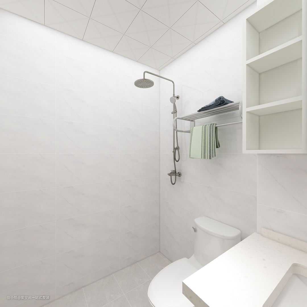 从这个角度可以看到特地在淋浴间外设计了宽敞的淋浴区,配套布置了毛巾架,右手边是卫浴柜,用来就近收纳洗浴用品、浴巾等。