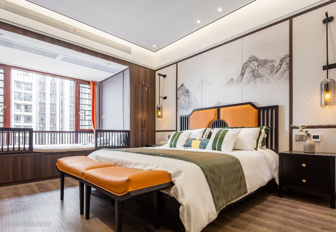 △ 另一间次卧的整体面积也是非常的宽敞的,阳台是整个空间的一个小亮点,因为采光是足够的,为了避免空间的浪费就多做了一个休息的空间,而且在床头的位置是融合了木质元素的材料做了一个通顶的收纳柜,能解决基本的收纳问题。主床头的后方是采用了山水画为背景墙搭配着两盏圆形的吊灯更能衬托出中式的意境氛围。在床头的两侧是采用了黑色木质的床头柜来点缀整个空间,当然也能进行小物品的收纳。
