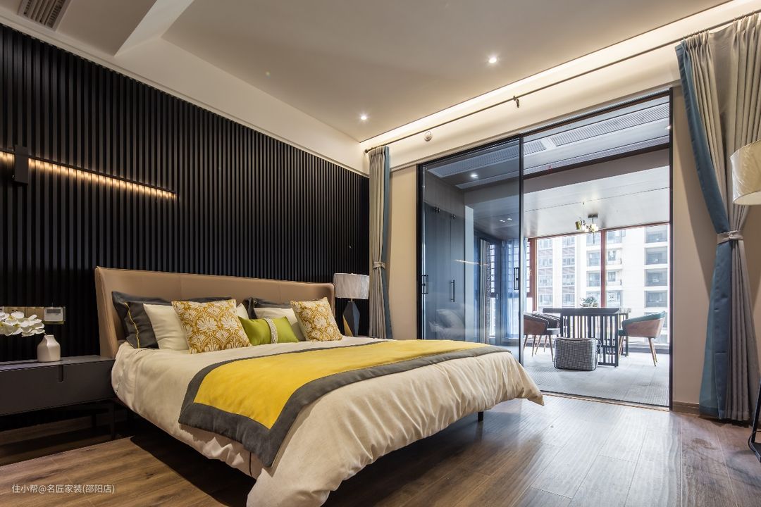 △ 主卧的面积非常的宽敞,卧室和阳台也是用了封窗的布局来做隔断,阳台照射进来的采光是非常的充足的。这里的空间布局也是采用了无主灯的设计,用筒灯和射灯来确保空间光源的充足,墙壁没有采用装饰画做点缀取而代之的是兼具立体木格栅背景墙,格栅背景墙在灯光的烘托下,意境悠远,整体的材质细节更具有层次感,简约精致又十分的舒适。格栅这样的朦胧质感是其它元素不具备的,也是其它板材不拥有的,黑色的格栅作为一个空间的视觉焦点搭配上筒灯与射灯,让整体空间会显得更加的温润柔和。