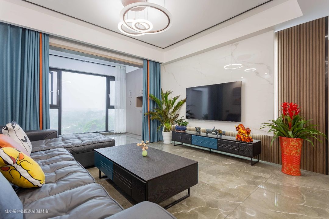 客厅的采光非常的充足,超大的落地窗,空间的通透性也非常的好,偶尔也可以看一下风景,蓝橙两色搭配的窗帘也毫无违和感#落地窗#窗帘