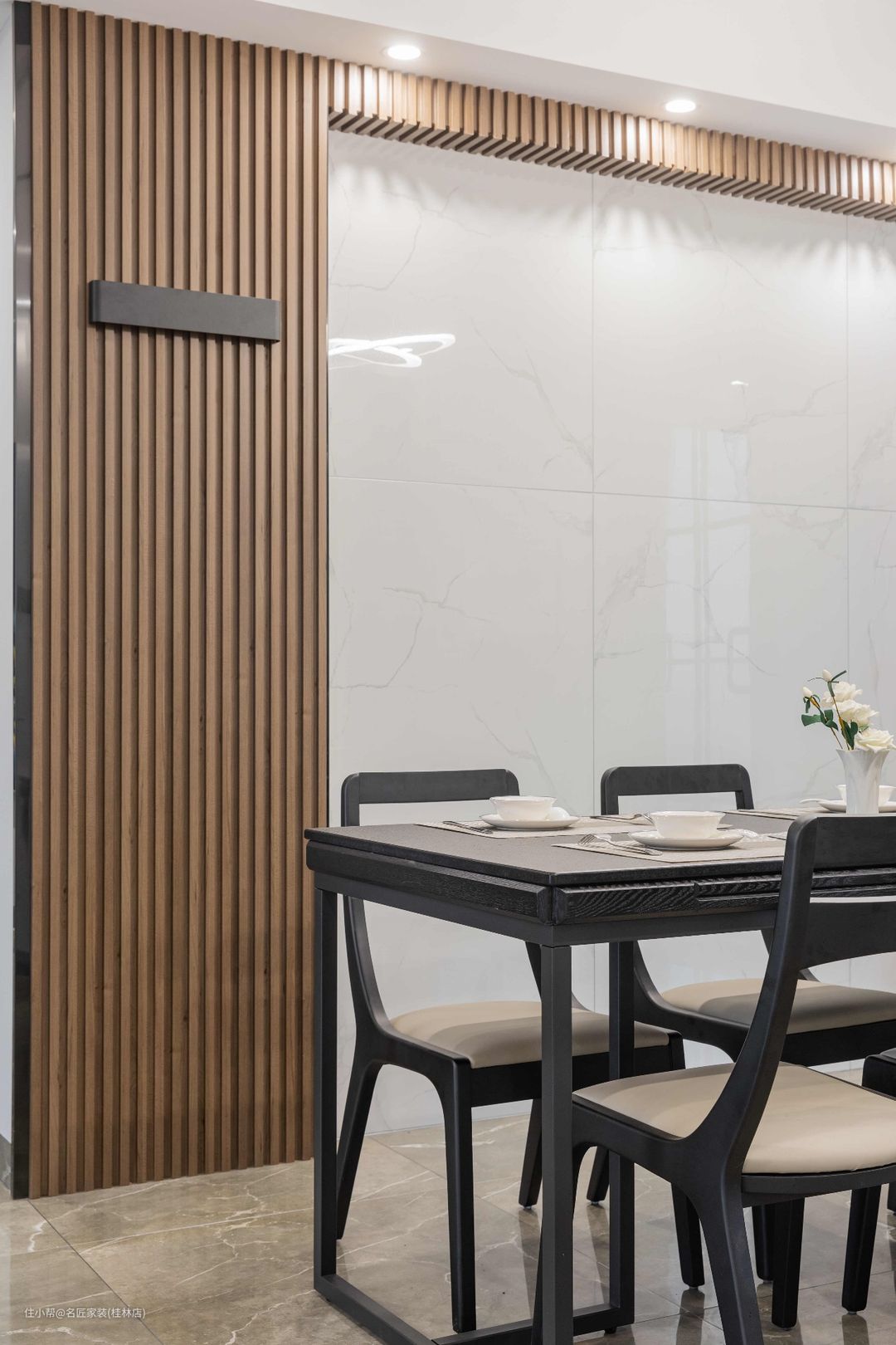 餐桌后面的墙壁是大理石的材质和黄铜色搭配,两个都是暖色,毫无违和感!