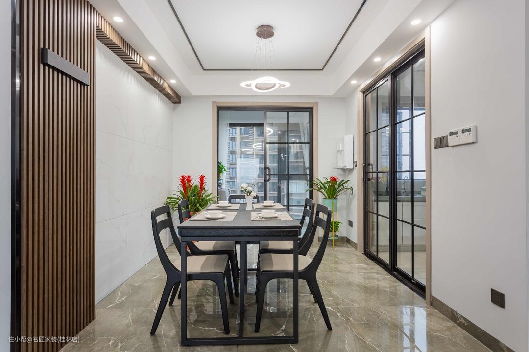 餐厅采用的是六座餐桌,黑白色搭配很有文艺感。和阳台连接的也非常的近,空间的通透性和采光也充足。