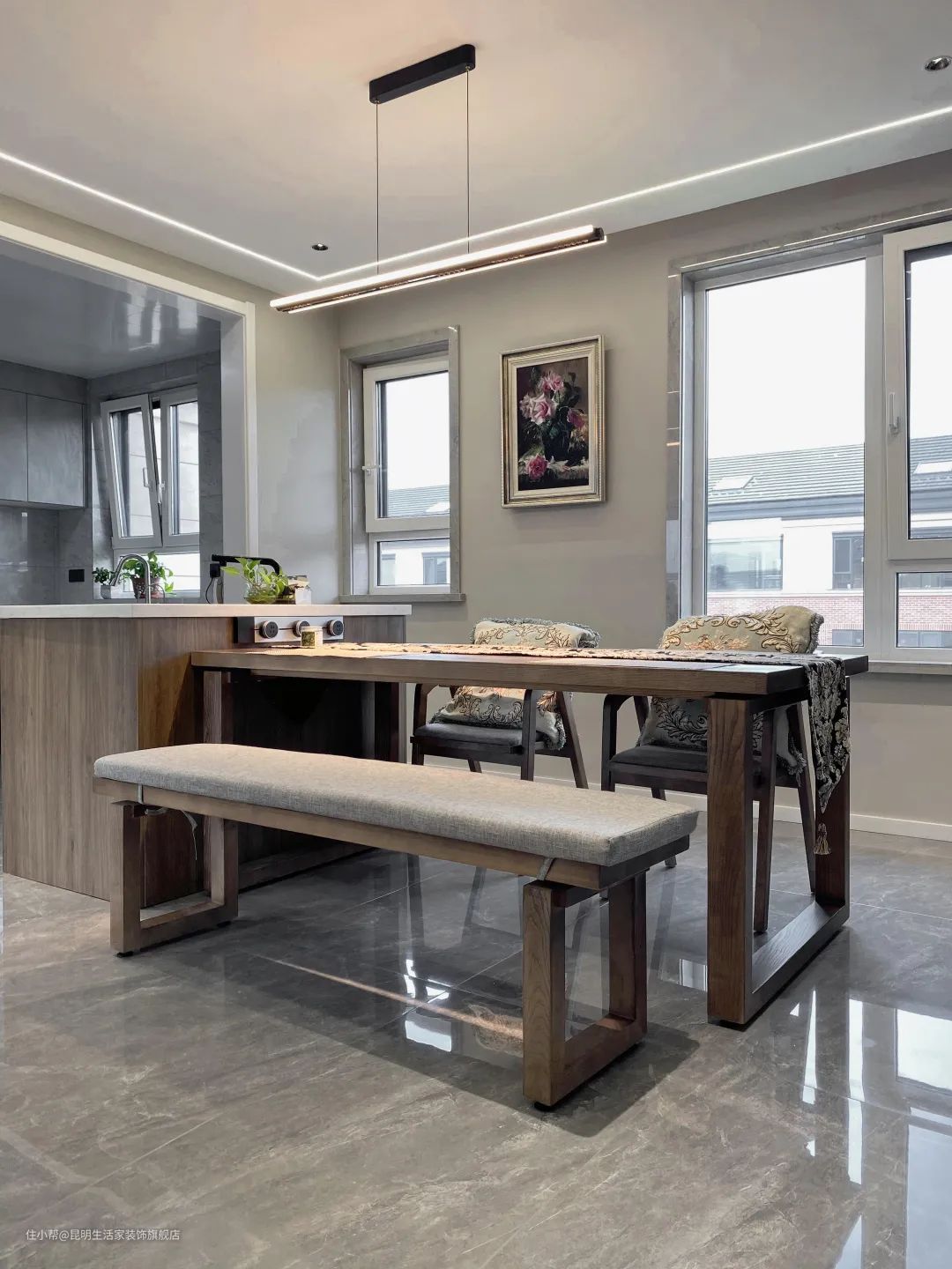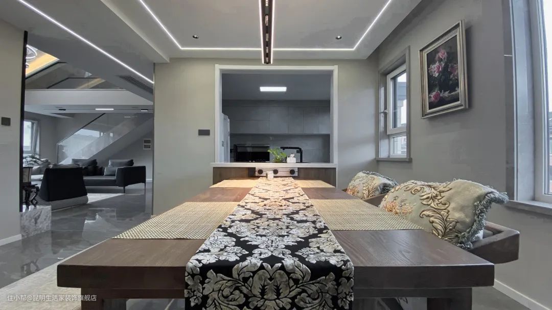 餐厅的餐桌连接岛台,设置有轨道插座,满足餐桌聚会、工作等用电需求。同时,岛台配置了水槽、收纳空间,增加了功能性。
