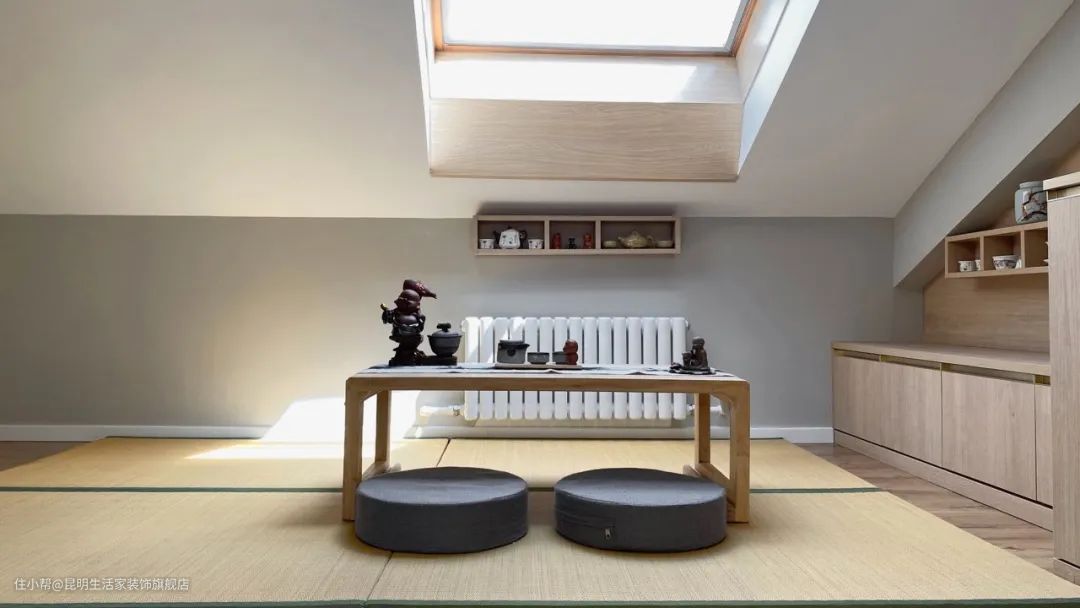 走廊左侧是茶室,斜顶的天窗提高通透感和趣味性,夏夜茶饮闲谈后,还能打开天窗遥望星空,舒适又惬意的生活不过如是。
