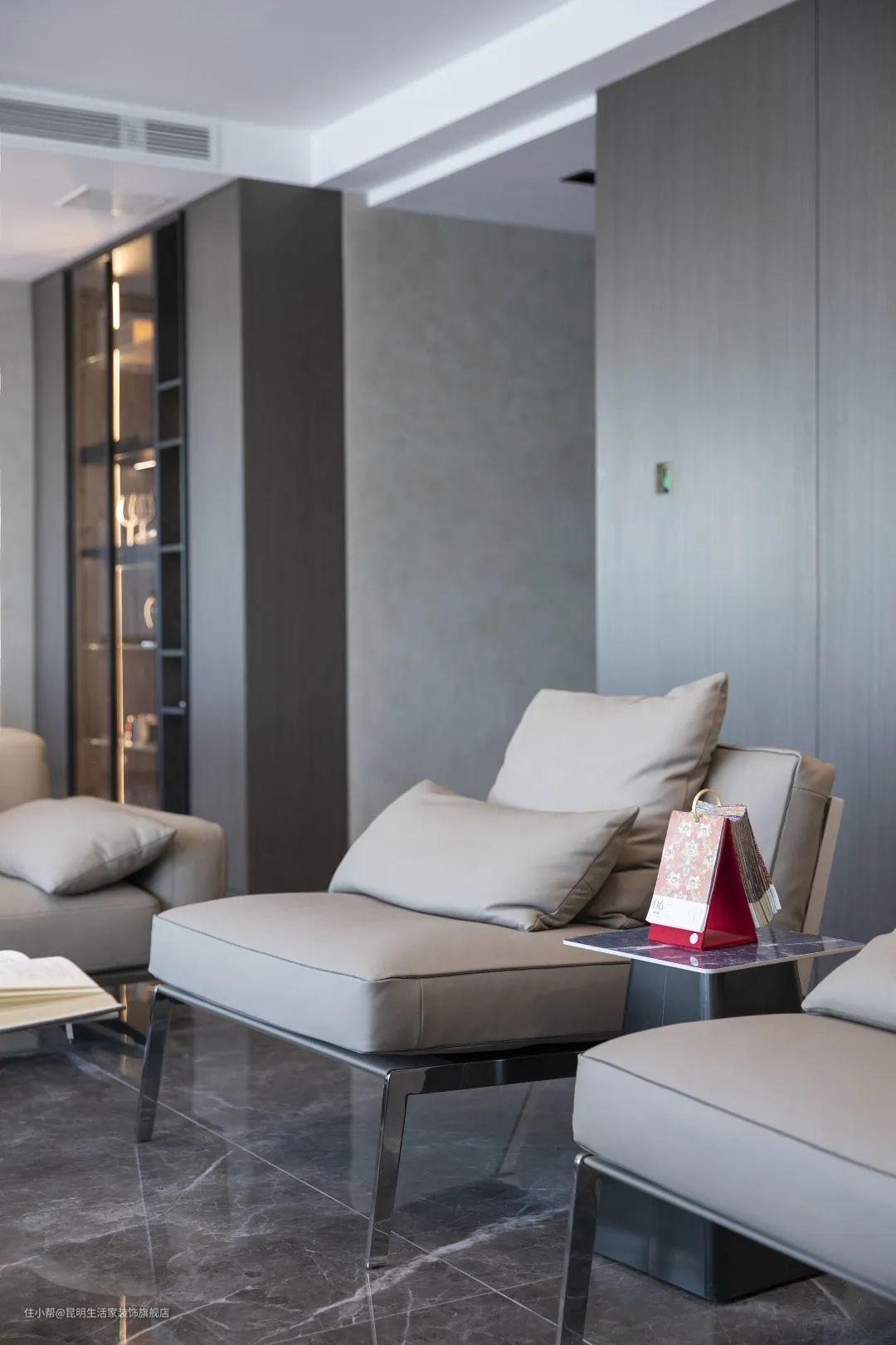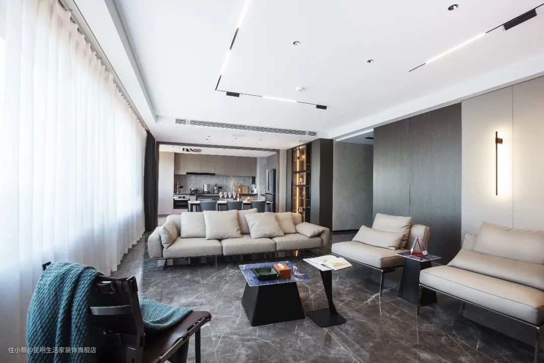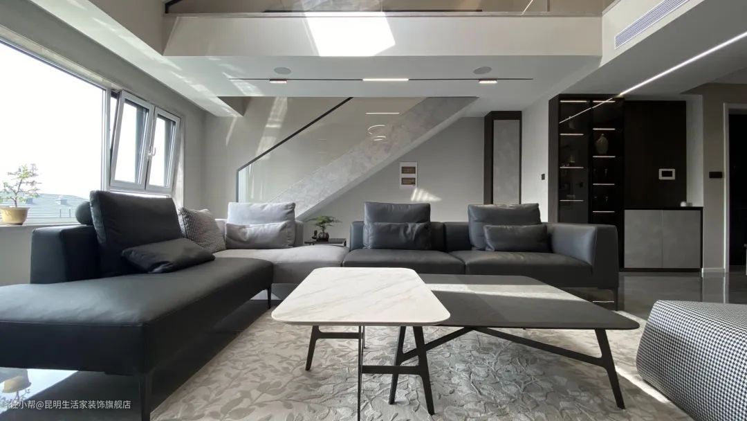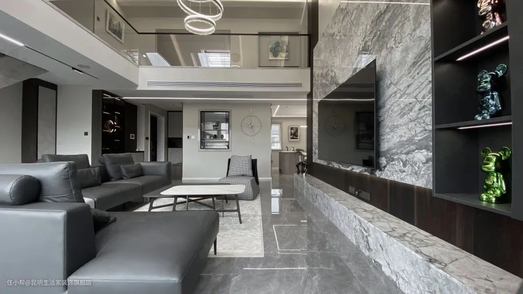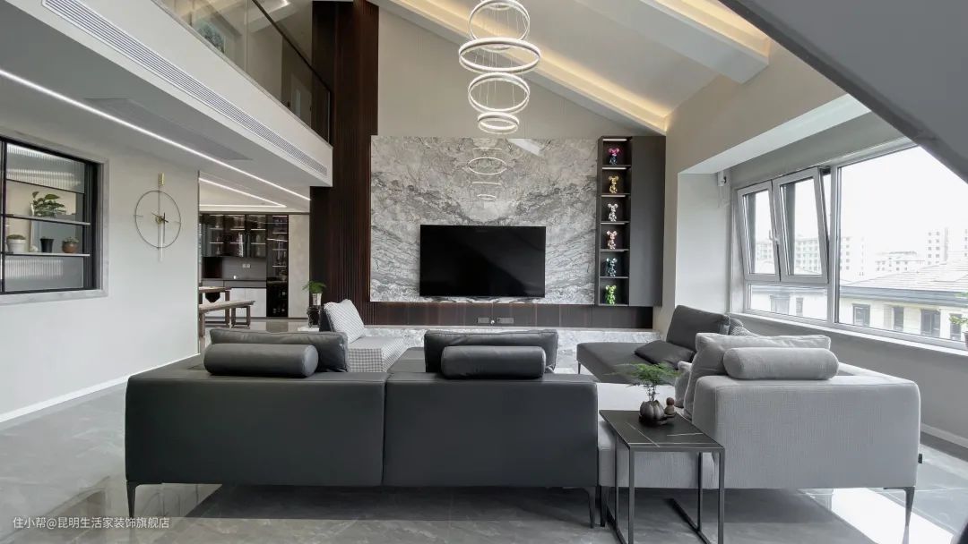 客厅环岛式布局,让空间动线更灵活,社交互动更自在舒适。电视背景墙采用黑白纹理石+木饰面,延伸至二楼,简约又大气。