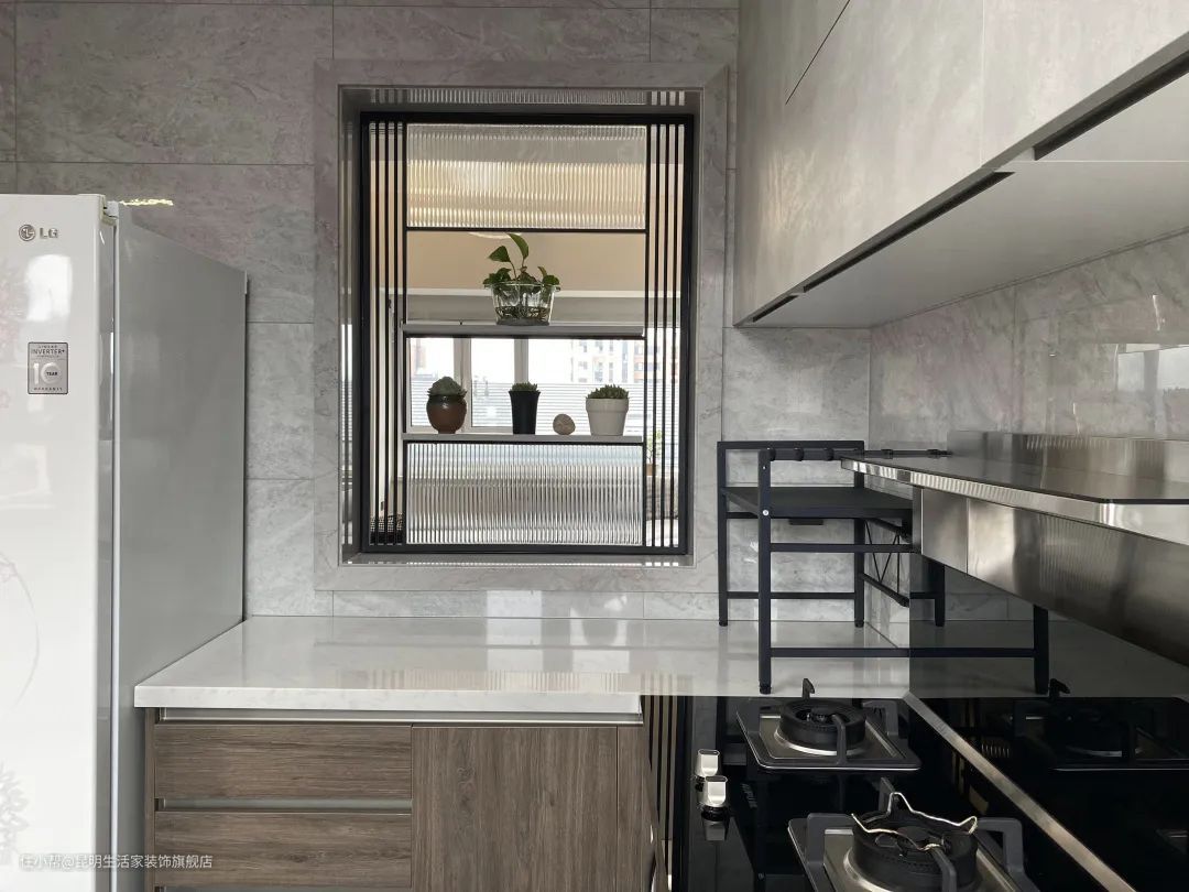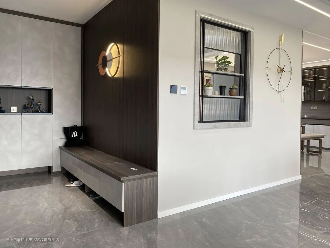 入户背靠厨房,一面墙正对客厅,为了让墙面不显乏味,设计师打造了一扇窗户,摆上绿植,修饰墙面的同时,增强了互动。