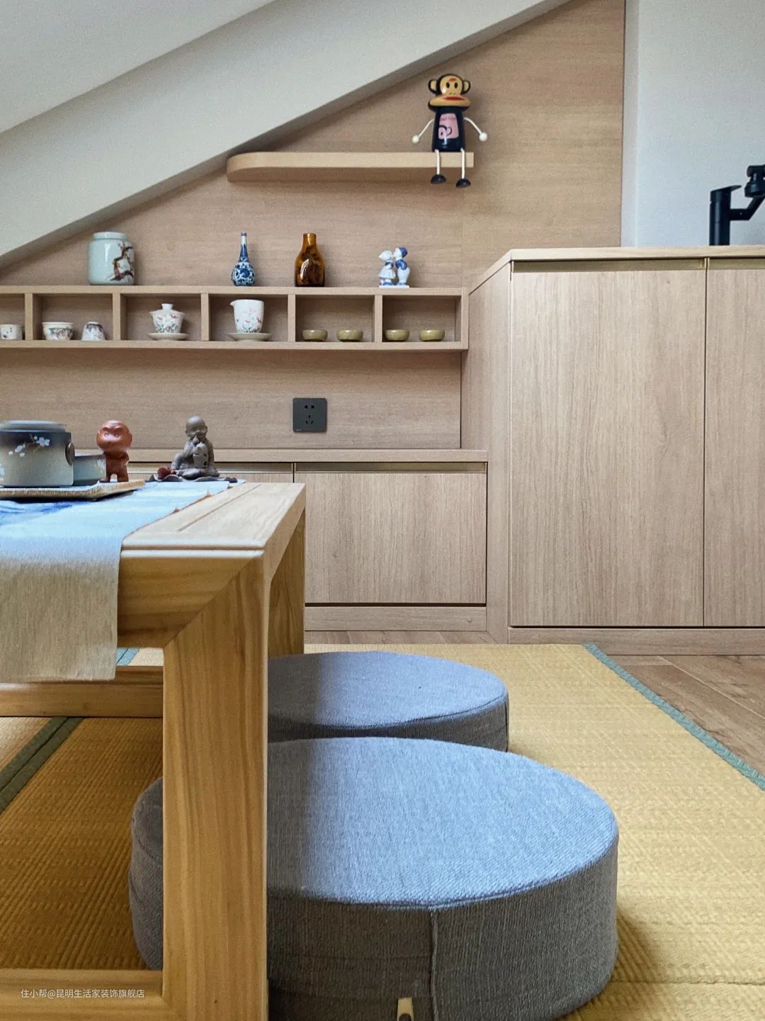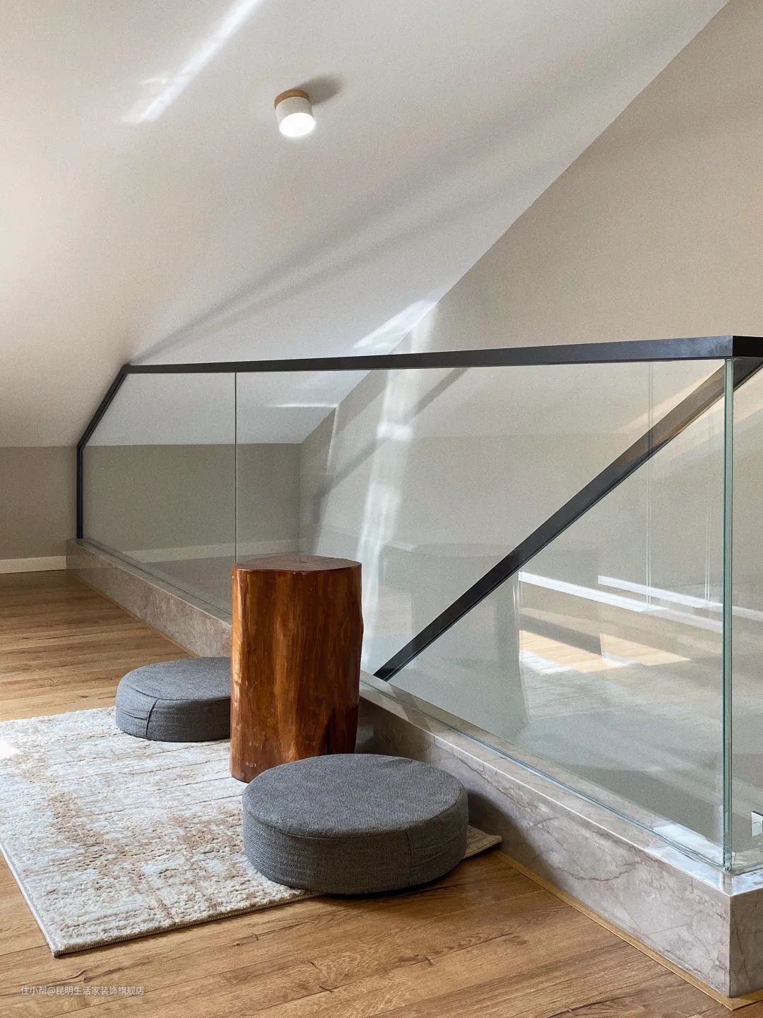 二楼主要设置茶室、主卧、主卫等私密空间,布局相对随性自由,转角处的走廊,以打磨后的树干为书桌,铺上两张蒲垫,便打造了一个简易随性的“读书角”。