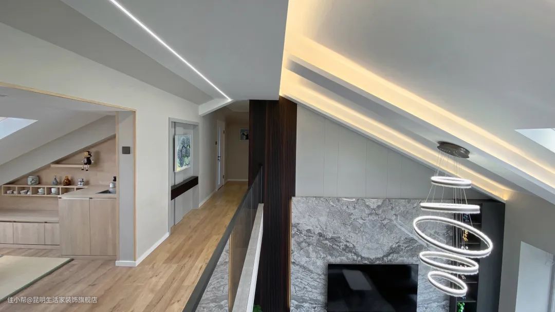 客厅挑高,大横窗+天窗的组合,给人的第一感觉就是开阔而明亮,大吊灯搭配氛围灯带,很好地装饰了天花板。