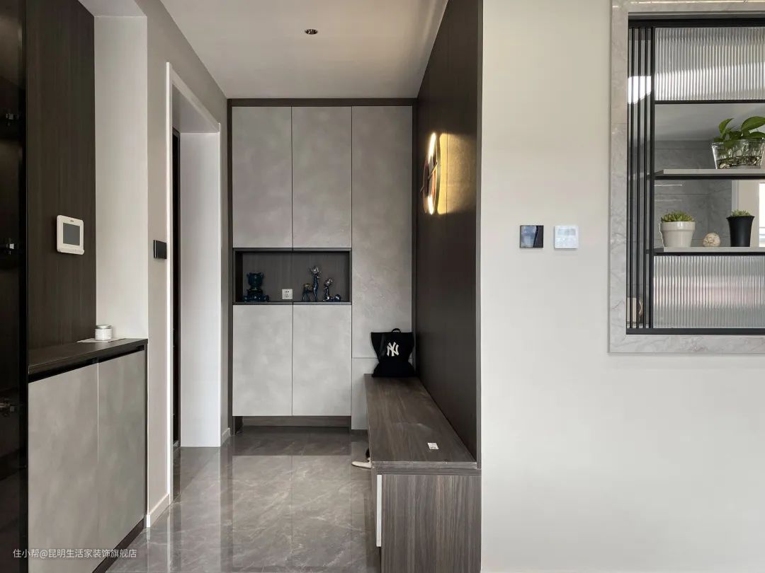 入户空间不大,采用分区收纳,左侧通顶柜收纳鞋、清洁工具等物品;设置长条凳满足多人使用,底部收纳鞋套、雨伞等小物品;右侧收纳柜+展示柜,过渡到客厅。