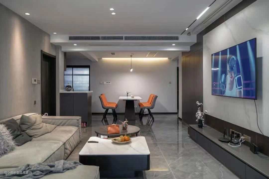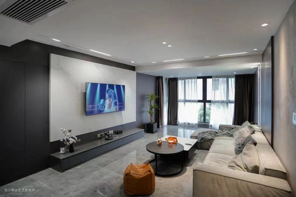 客厅采用了智能灯光系统,并围绕不同的生活场景规划照明。比如回家时头顶的玄关灯会感应亮起;在沙发上看书时,只用开启头顶的阅读灯即可;看电影时开启灯带,增添氛围感。