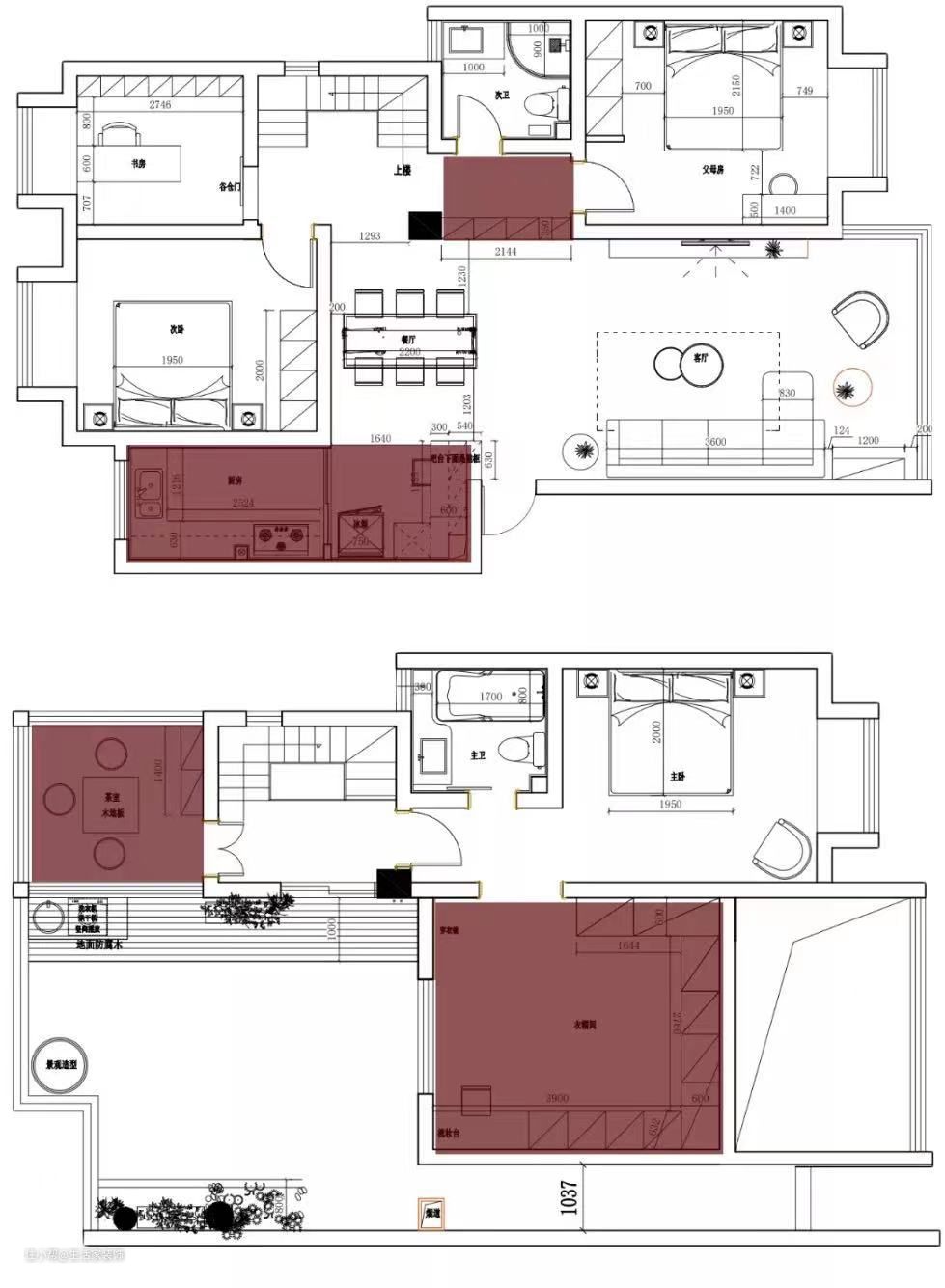 厨房:改变原始厨房布局,打通生活阳台,将厨房内移,外部空间改造成西厨吧台,放置大冰箱。 次卫走廊:将老人房门洞内移,拆除走廊墙面后,嵌入一组通天柜,作为客厅收纳空间。 二楼茶室:将茶室门洞改为靠近楼梯口,动线更方便。 衣帽间:将二楼花园改造,通过搭建墙体为主卧打造出一个衣帽间,满足主卧收纳需求。