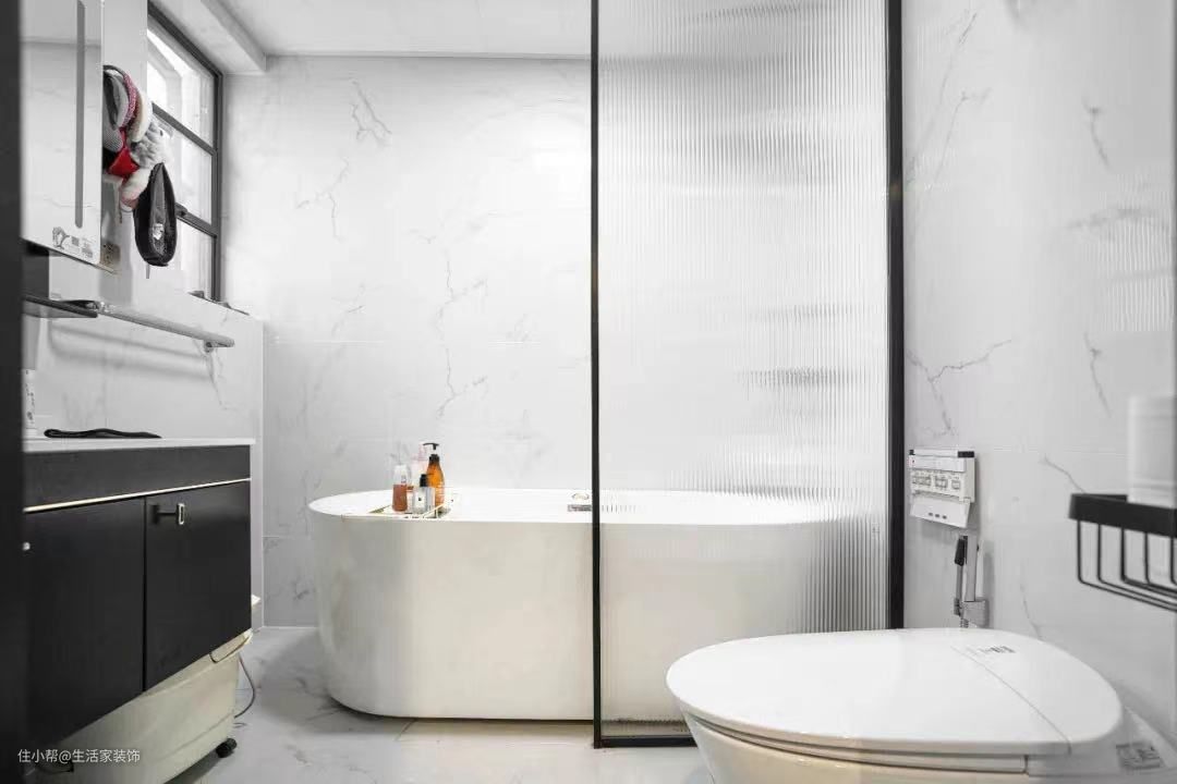 穿过衣帽间便是主卫,主卫以黑白极简色调让空间显得干净爽朗。长虹玻璃隔断,既满足了干湿分离,也让空间更加通透、时尚。