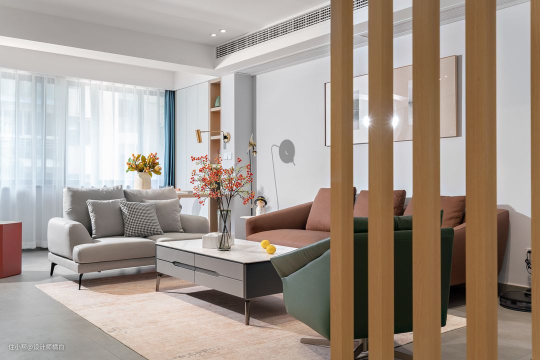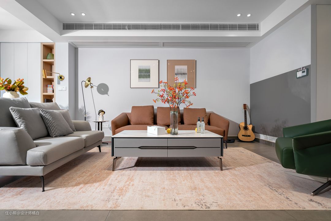 客厅以灰和咖为主色,不同层次的灰咖色以多元的形式相互交融组合,软硬装在同一空间里实现了彼此呼应,整体的搭配感更强,也更有和谐度。