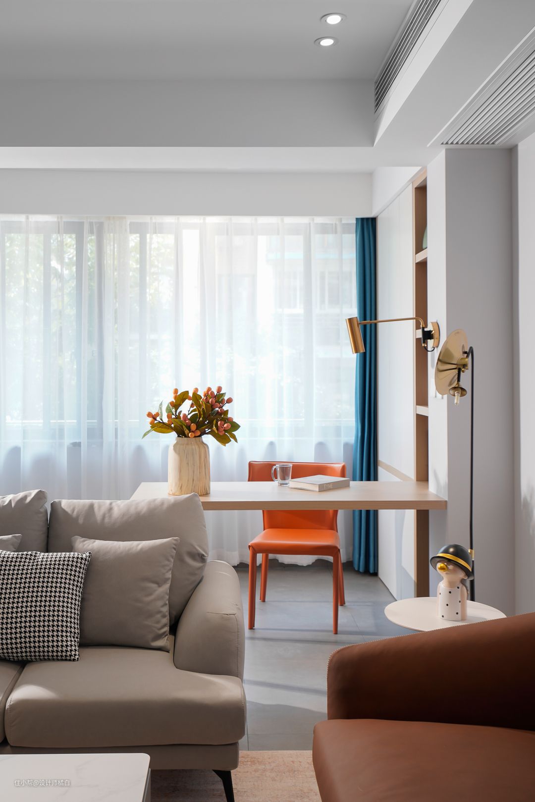 客厅阳台打通,布置成开放式书房,客厅的功能性随之增加,加强了人与人之间,空间与空间的互动与沟通。