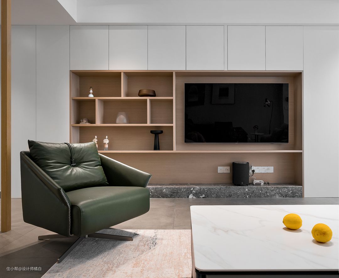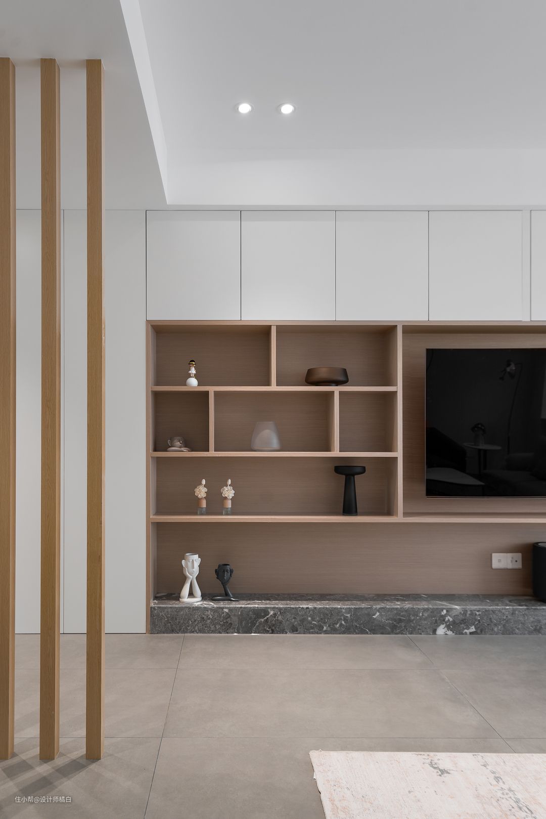电视背景设计成整面柜体墙,整体空间感得到有效延伸。柜体形式有开有合,能满足不同类型的收纳需求。