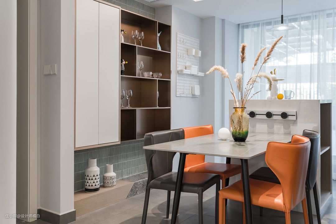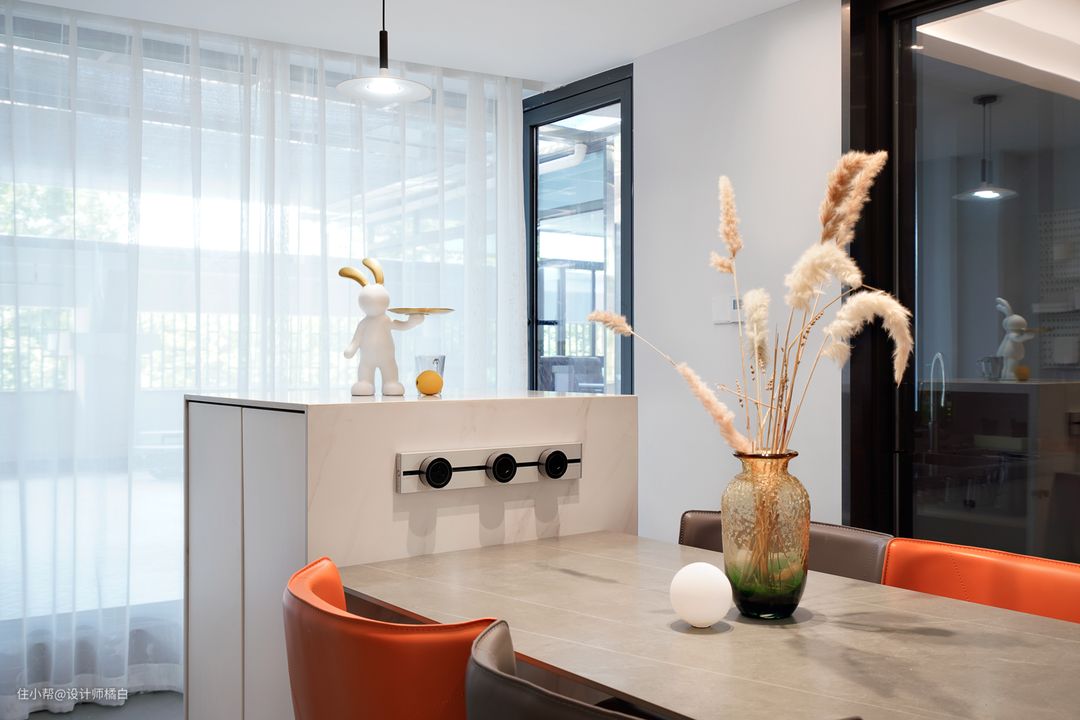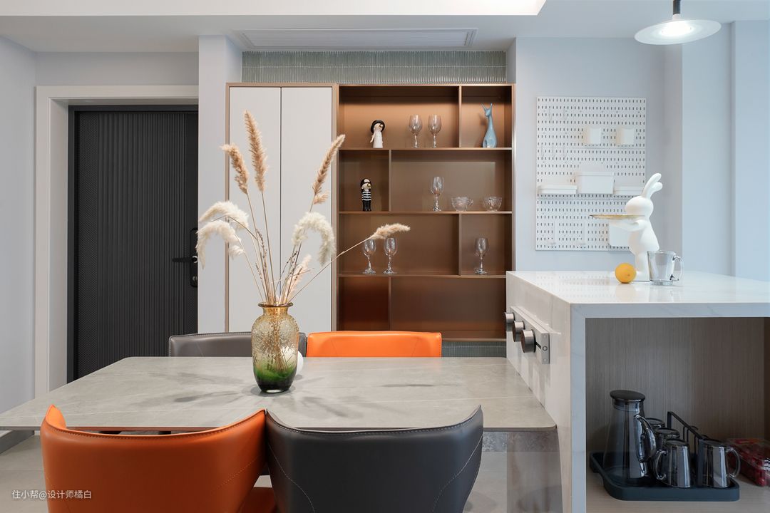餐桌与吧台连结,形成连续的动线,吧台不仅自带储物功能,装上移动排插后,丰富了餐厅的功能性和体验感。