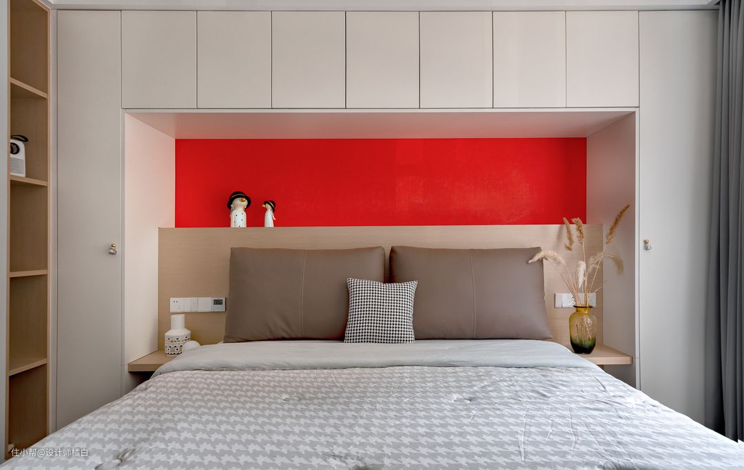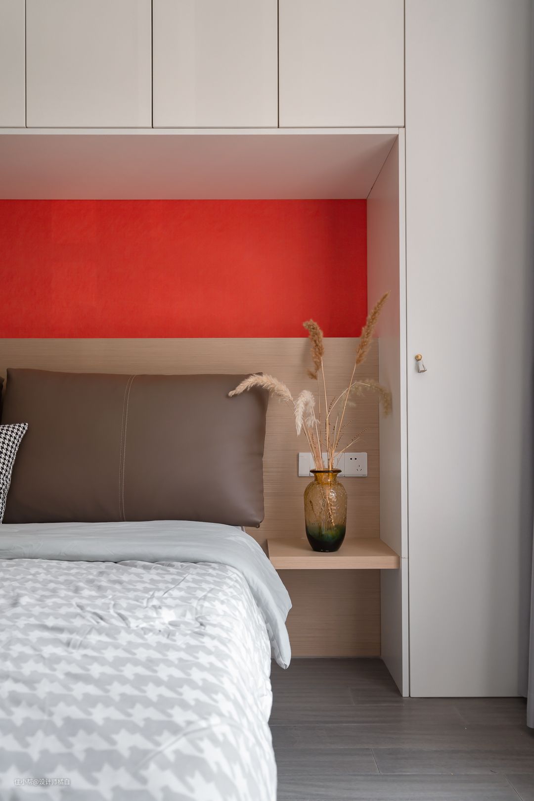 主卧的床头背景墙别出心裁,将美观与收纳巧妙融合,一抹正红色打破浅色调的平淡,为空间带来更多浪漫的情愫。