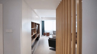 1. 入户借助墙体设计出优雅的玄关小景,走廊处做一道木格栅屏风隔断,巧妙形成动静合一的双过道,营造出曲径通幽、移步换景的空间感; 2. 客厅阳台打通,布置成开放式书房,客厅的功能性随之增加,加强了人与人之间,空间与空间的互动与沟通。 3. 主卫采用了“玻璃墙”的隔断方式,不仅增强暗卫采光,同时也更容易制造情调氛围。
